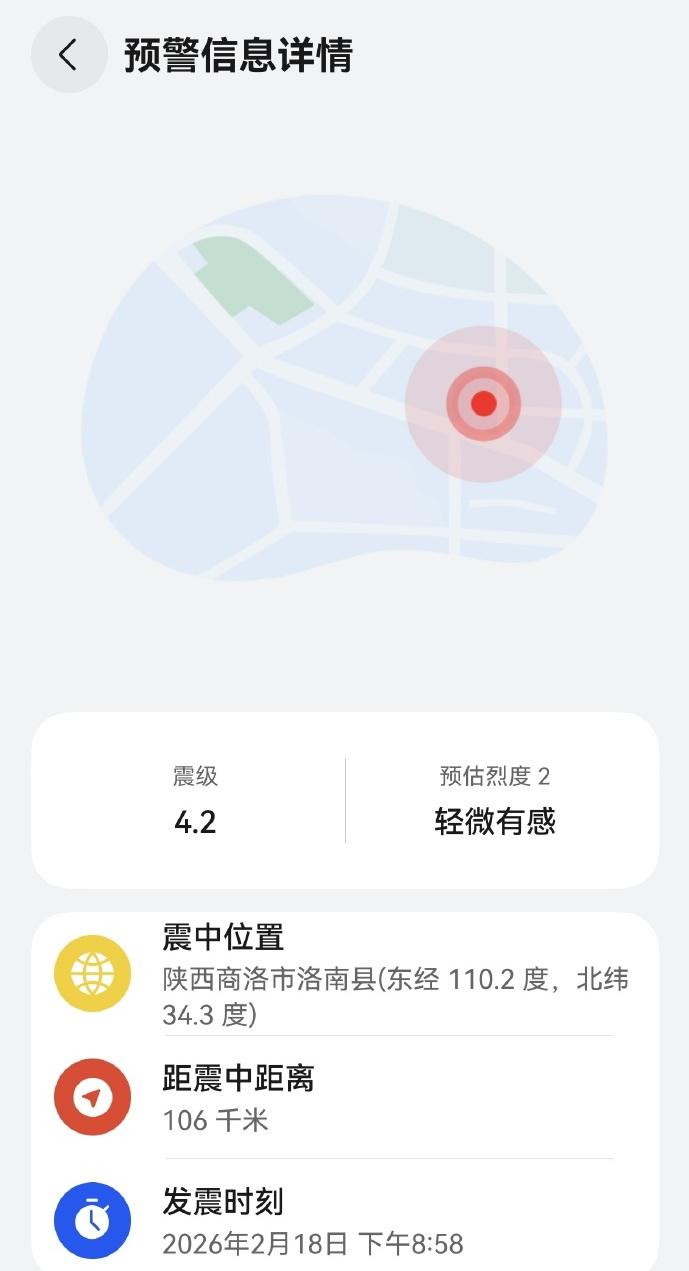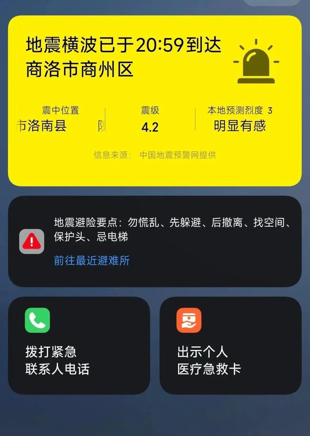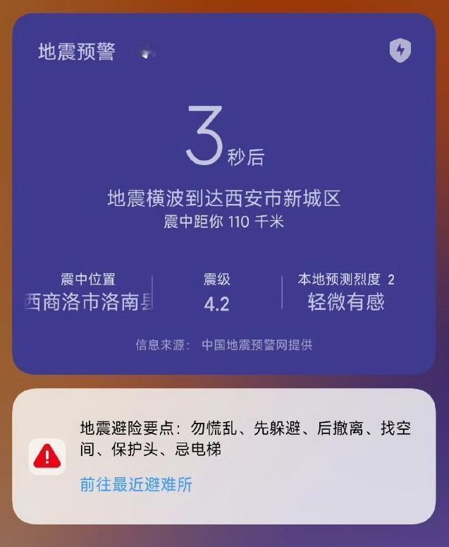 今晚西安有震感!你收到预警了吗?刚才21点左右,不少西安朋友表示感受到了晃动。据中国地震台网正式测定:02月18日20时58分在陕西商洛市洛南县(北纬34.31度,东经110.15度)发生3.4级地震,震源深度10千米。   西安灞桥、未央、新城、莲湖、碑林、雁塔等区域有轻度震感,长安区、蓝田县、西咸新区无明显感觉。虽然震级不高,但这份科学应对指南请收好:   【遇震科学应对】 遇明显震感时,记住“伏地、遮挡、手抓牢”七字口诀,切勿使用电梯或盲目跳楼!   【预警功能设置】 还没开启地震预警的看这里:安卓用户可通过手机天气APP启用(如vivo:天气→设置→地震预警),为自己争取宝贵预警时间!大家注意安全,及时关注官方预警信息!