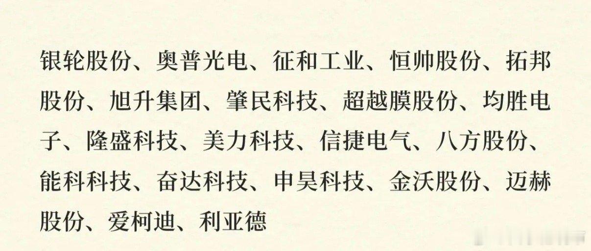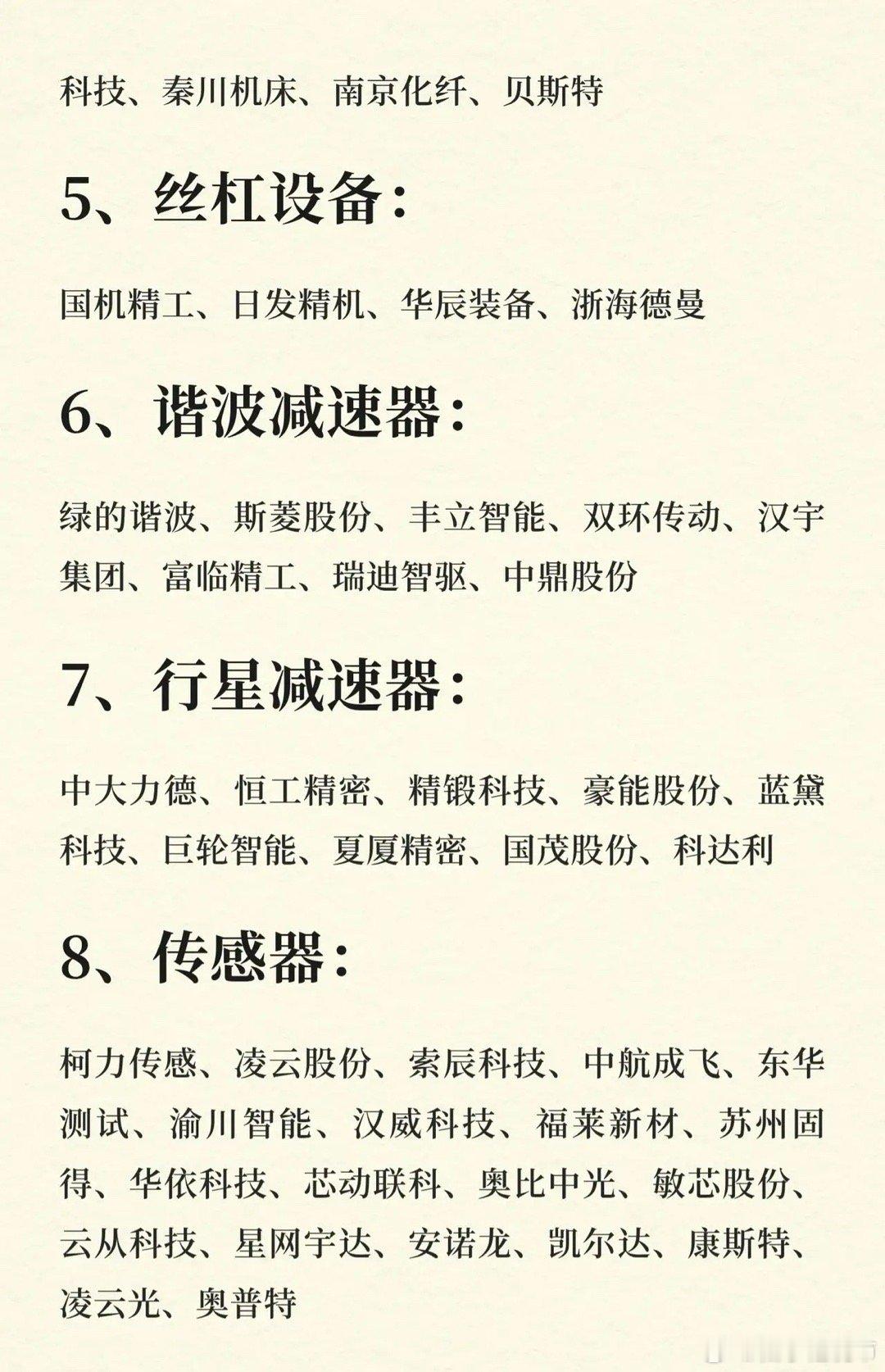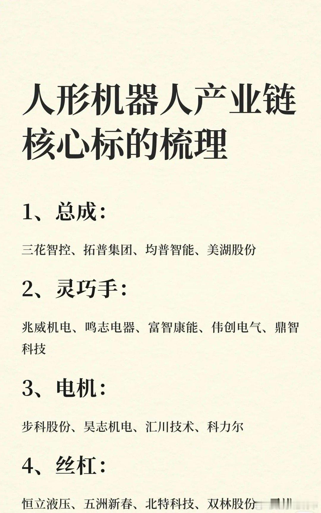 1. 核心组件:总成(三花智控、拓普集团等)、灵巧手(兆威机电、鸣志电器等)、电机(步科股份、汇川技术等)、丝杠(恒立液压、五洲新春等);2. 关键部件及设备:丝杠设备(国机精工、日发精机等)、谐波减速器(绿的谐波、双环传动等)、行星减速器(中大力德、国茂股份等)、传感器(柯力传感、汉威科技等);3. 基础材料与结构件:轴承(长盛轴承、襄阳轴承等)、腱绳材料(南山智尚、大业股份等)、结构件(祥鑫科技、浙江荣泰等)、加工刀具(锋镝工具、沃尔德等);4. 本体与应用及其他:本体及应用(埃夫特、新时达等),及银轮股份、奥普光电等其他相关企业。