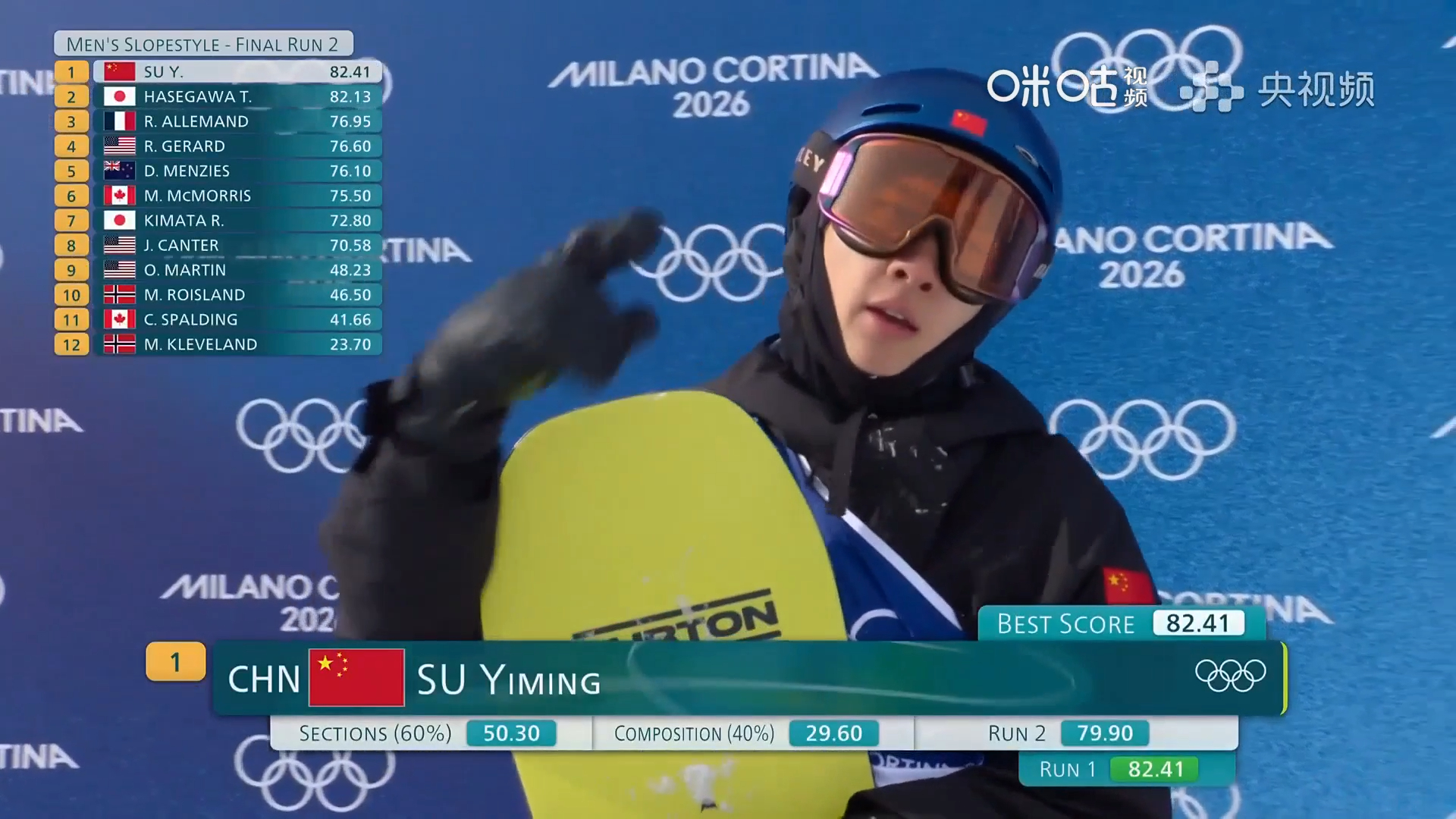 决赛第二轮争夺结束,苏翊鸣凭借第一滑82.41分,依旧暂列第一。