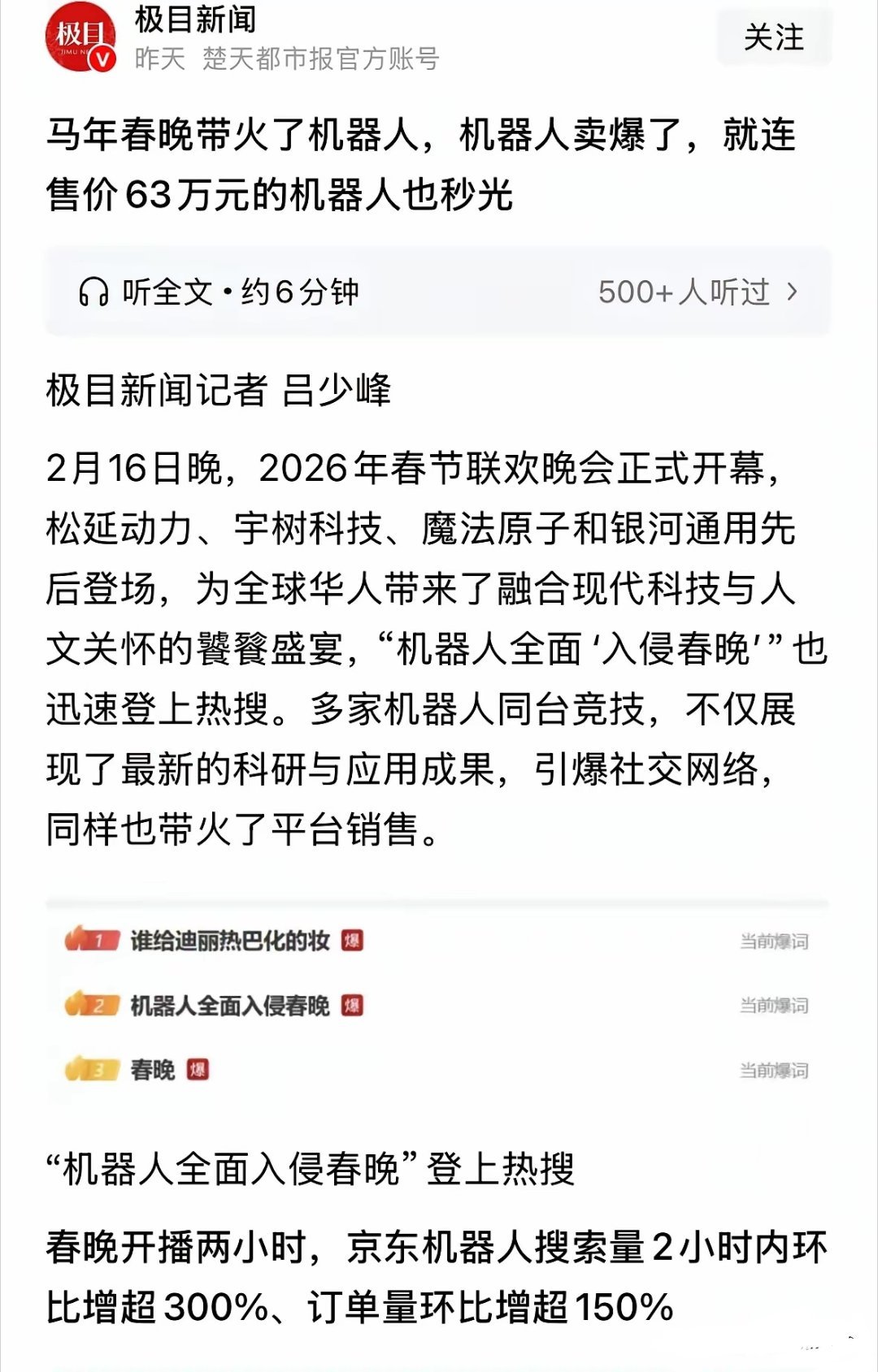 春晚带火机器人卖爆了你怎么看?中国人形机器人为何热衷舞台表演离家用有多远:不吹不黑,中国人形机器人到底实力如何?大年初二,很多买了机器人板块的人已经恨不得股市马上开门,好大涨赚钱了,满怀期待,媒体也不断爆出,春晚带火机器人,卖爆了,63万元一台的机器人也秒光,而且除了春晚舞台,欢乐喜剧人舞台等电视节目机器人演员都很出彩,喷水笑坏郭德纲。中国人形机器人为何热衷舞台表演?实力到底如何?如何影响A股的机器人板块?我今天专业分析:一是对A股的机器人板块,肯定是重大利好,虽然上春晚是预期之内,但春晚带货机器人,倒是超出市场预期的,尤其是带火了各种机器人,这个利好估计对机器人板块有超出预期的利好;二是2026年,目前国内人形机器人仅限于舞台表演和拍视频宣传,为何如此?因为真正离走进家庭商用还有很大的距离,不吹不黑,客观真实情况是:第一是机器人关节的自由度还不够,真人的手指、手腕、脚趾这些精细自由度,机器人还差很远,即便宇树机器人也达不到,所以人形机器人做家务,至少等5到10年再看了;第二是智能化程度受限制于大模型,不够智能,目前很多国内机器人都是遥控路线,跟遥控玩具一样的程序操作,还有一些机器人公司确实用的国外开源大模型,蹭热点概念的;第三是机器人电池技术不成熟:目前如果是真正的智能机器人,复杂工况半个小时就要充一次电,根本在家庭里不实用,根本没法照顾人。第三是2025年机器人确实有进步,但目前没看到特别重大突破,或者改变商业化应用的革命性突破,高盛报告说中国机器人商业化落地至少还需要5到10年,这个结论是靠谱的。当然,人形机器人技术是不断进步的。目前中国人形机器人热衷于表演,本身就是一大进步。春节后人形机器人可能会有一波短期炒作,要有大行情还需要等自由度、大模型、电池等方面的突破,离家用还要等不短的时间。