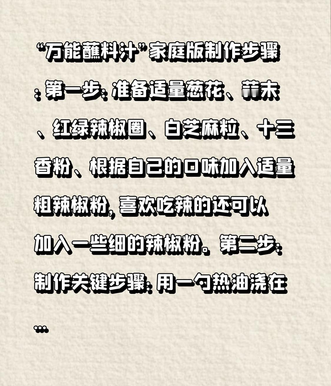 “万能蘸料汁”家庭版制作步骤: 第一步:准备适量葱花、蒜末、红绿辣椒圈、白芝麻粒、十三香粉、根据自己的口味加入适量粗辣椒粉,喜欢吃辣的还可以加入一些细的辣椒粉。 第二步:制作关键步骤:用一勺热油浇在这些食材上把调料炸香,接着加入两勺生抽、一勺醋、一勺蚝油、一勺白糖、半勺盐、一勺香油,搅拌均匀,美味的万能调料汁即成。 学会这个调料汁,无论蘸鸡、鸭、鱼、肉,还是熟食、青菜,都好吃,是年夜饭等场景的必备蘸料。