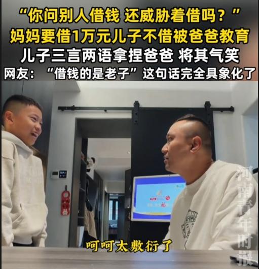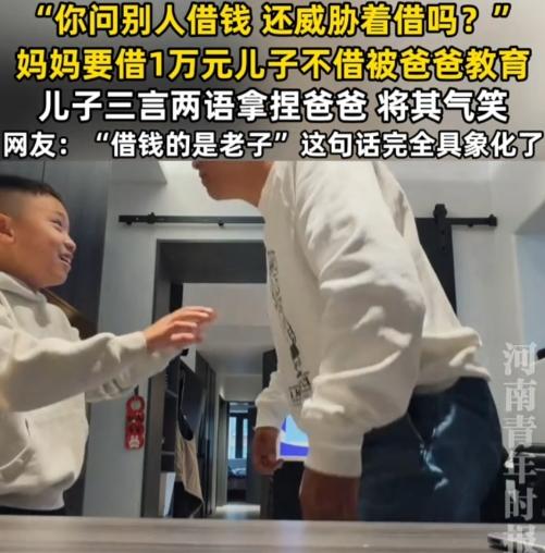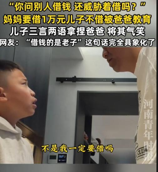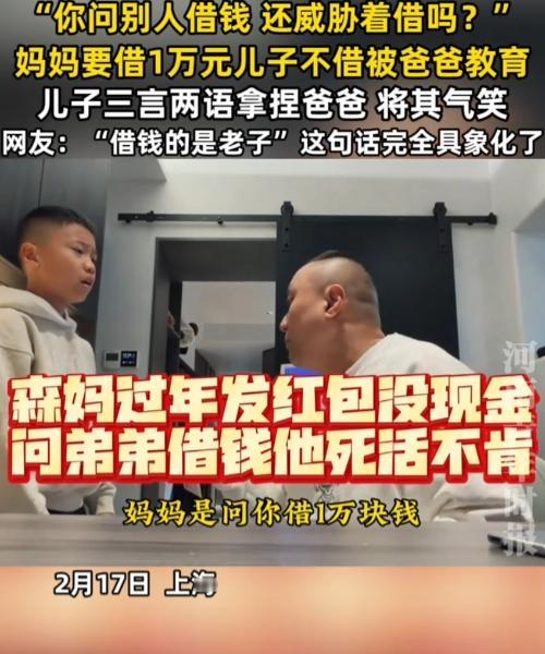 上海,一妈妈问儿子借压岁钱,1万元,儿子不借被爸爸“威胁”,儿子据理力争,把爸爸给气笑了。 “因为这是压岁钱,我本来就剩10%,别的都给你们了,还还倒问我借钱。” “妈妈是问你借1万块钱,会还给你的,现在为什么会骂你,是因为你为什么那么小气,借一万不是问你要一万块钱,你觉得这样对吗?”爸爸美名其曰教育,但是语气、动作、态度,都透露着质问的感觉,盛气凌人。 当儿子刚开口说反对的理由,爸爸就站了起来,企图用气势来压倒儿子,阻止儿子反抗。 “不是你你你要求别人借,不是我一定要借吗?你问别人借钱,你还这这样一副凶狠狠表情看别人。”很明显爸爸这招气势压人,让儿子感觉到压力,儿子说话都结巴了。但是仍不放弃,清晰表达自己理由。 当爸爸坐下来,儿子的分贝明显增大“你老是威胁别人,我知道我想借就借,而且你现在又一直摆副面孔,我……你觉得我肯借吗?” “是因为你小气,我才摆这副面孔。”爸爸仍觉得自己很对。 “你不摆我就借了!”“可以,我不摆。” “但你但你这副,但你你这讲话态度我感觉不太对。”直接把爸爸逗笑了“不要指着我,不要指来指去。” 爸爸不再指来指去,语气缓和询问儿子可不可以借。儿子一句“太敷衍”,直接让爸爸再次回到刚开始威胁语气、站立的姿势,儿子马上习惯性躲了。 估计这儿子常被打,所以儿子怕爸爸,但是为了维护自己仅剩的10%压岁钱,儿子不妥协。太勇敢了! 这语气,这态度,这架势,要是没有这层父子关系,可以直接告爸爸威胁抢劫了吧。这是明晃晃的抢,是欺负小孩,是用亲情当幌子耍无赖啊! 儿子说的很清楚,他要的是尊重,想要的是父母借钱的态度,根本不是钱不钱的问题。 真正合格的父母,是不会把孩子的压岁钱当成自己的钱,也不会用威胁、道德绑架、暴力去逼孩子。