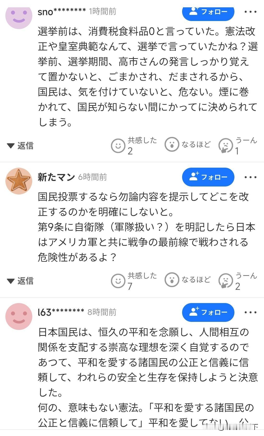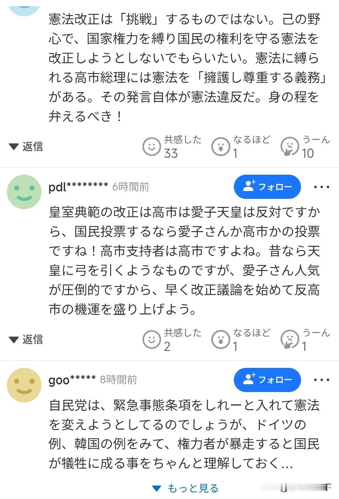 日本现职指导者在两院议员总会强调说要挑战修改宪法。现在众议院已经具备了单独发议的能力,现在的方针是让高市心腹担任宪法审查会长。 高市说:“要修改日本国宪法,皇室典范。这两件事都要切实挑战。太好了!” 关于她的这个表态, 有日本网友说: “消费税减税的事,怎么不提了?自民党和高市要改宪,是非常危险的行为。改皇室典范也是无视民意的事情。担心过几年回想起来的时候发现这对日本是个很可悲的转折点啊。” “全体国民都应该好好读一读自民党的宪法改正草案。比较好明白的是网上能看到的`自民党改宪草案会把宪法改成什么样?’油管上也有详细解释。如果不好好就全民投票以后后悔也没用了。” “改宪不是应该`挑战‘的事情。为了自己的野心,修改限制国家权力保护人民权利的宪法是不应该的。被宪法限制住的高市有拥护尊重宪法的义务。她说这样的话本来就是违宪的。太不自量力了!” “要改皇室典范是因为高市不喜欢爱子公主。国民投票的话就是要么高市要么爱子公主。高市的支持者一定会选高市吧。就好像以前对着天皇挽起弓箭一样。爱子公主有压倒性人气,我们应该尽早开始讨论把反高市活动带起来。” “选举以前他们说消费税食品税免税,他们说了要改宪,要改皇室典范了吗?他们选举期间说过的话我们不记清楚的话,以后被骗就太危险了。” “改宪公告里他们肯定都要写清楚的吧。如果改了宪法9条,把自卫队改成军队,那不是有要跟美国人一起去前线的危险了吗?” [微风][微风][微风] 看目前的评论还都是比较理性的。不知道以后会如何发展。 警惕警惕!