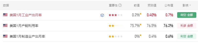 今晚有多项美国数据公布。 首先美国1月工业产出月率 0.7%, 市场预期0.40%,前值由0.40%修正为0.2%。 其次美国1月产能利用率 76.2%, 市场预期76.5%,前值由76.30%修正为75.7%。 最后美国1月制造业产出月率 0.6%, 市场预期0.4%,前值由0.20%修正为0%。 这三项数据,有一项利多金价, 有两项利空金价的。 不过数据公布以后,金价略微减弱一点, 仍处于反弹上涨中!