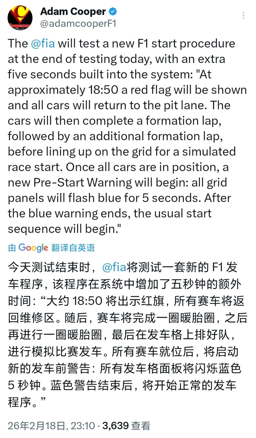 FIA国际汽联将在今天测试的最后10分钟进行一次新的发车程序测试,会率先出示红旗🚩所有赛车返回维修区后,将进行一次出场圈+暖胎圈,最后停在发车格上准备模拟正赛发车(发车格信号灯会先亮5秒蓝灯,然后再进行正常的发车程序~五盏红灯全亮~熄灭)F1赛车2026F1季前测试