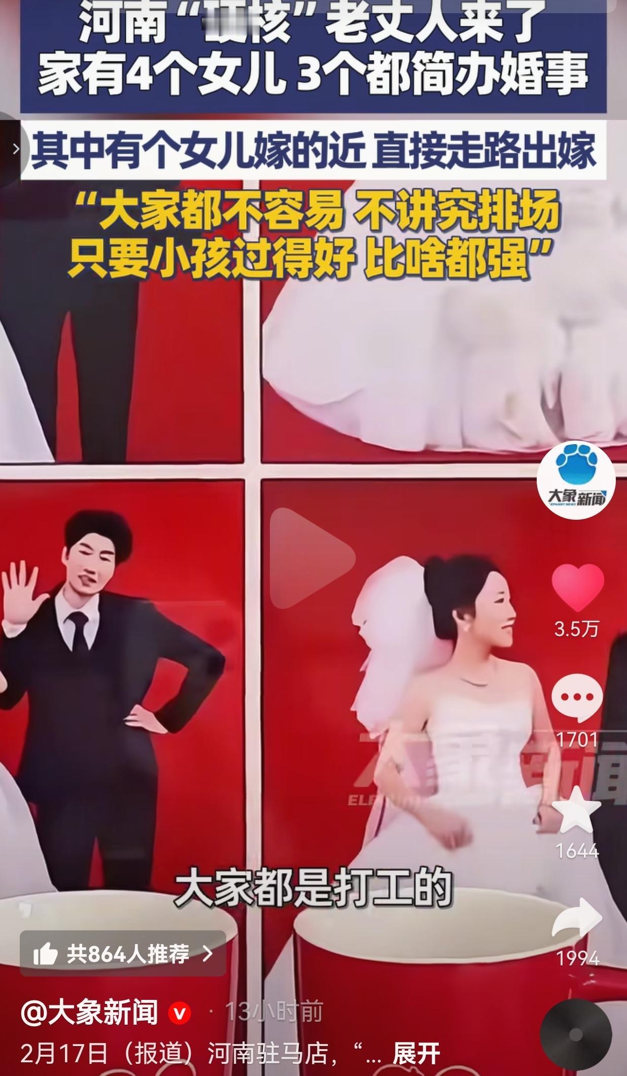 这老丈人真的是人间清醒!最近,河南驻马店一位老丈人的操作,把全网都看愣了。 他家里有4个女儿,其中3个的婚礼全是简办,没有豪车车队,没有大摆宴席,甚至有个女儿因为嫁得近,直接从娘家走路就嫁过去了。 有人说他太抠门,也有人说他不懂规矩,可老丈人一句话,让所有人都闭了嘴,他说:“大家都是打工的,老百姓不容易,不讲究排场,只要小孩过得好,比啥都强。” 其实,在很多人的印象里,女儿出嫁,那必须是风风光光的:豪车开道、鞭炮齐鸣、婚纱拖尾好几米,恨不得让全世界都知道。 可这位老丈人偏不。 有个女儿嫁得近,他大手一挥:“不用车接,走路过去就行,几步路的事儿,省下来的钱,小两口留着过日子。” 没有浩浩荡荡的车队,没有精心布置的接亲现场,女儿穿着红袄,笑着从娘家大门走出来,几步路就到了婆家。 有人说:“这也太寒酸了,女儿一辈子就结一次婚,连个像样的仪式都没有。” 可老丈人心里门儿清:排场是给别人看的,日子是自己过的。与其把钱花在撑面子上,不如让小两口手里多留点余钱,日子过得踏实点,比什么都强。 现在的婚礼,越来越像一场“军备竞赛”:彩礼要几十万,酒席要几十桌,婚纱照要拍几万块,接亲车队要清一色的豪车…… 很多年轻人结个婚,掏空了双方父母一辈子的积蓄,甚至背上沉重的债务,婚后日子过得一地鸡毛。 可这位老丈人,偏偏反其道而行之。 4个女儿,3个简办婚礼,不拼彩礼,不拼排场,不拼面子,只拼女儿婚后能不能过得舒心。 他说:“大家都是打工的,谁的钱都不是大风刮来的,没必要打肿脸充胖子。只要小两口和和气气,日子越过越红火,比啥排场都强。” 这句话,戳中了无数人的痛点。 我们总说“婚姻是爱情的坟墓”,可很多时候,压垮婚姻的不是爱情,而是那些被“规矩”绑架的排场和面子。 有人说,这位老丈人“硬核”,可我觉得,他才是最懂爱的父亲。 他没有用豪车和彩礼来“证明”女儿的价值,而是用自己的通透和清醒,给了女儿最足的底气:结婚不是为了给别人看,而是为了找个能一起过日子的人。幸福不是靠排场堆出来的,而是靠两个人一起打拼出来的。娘家永远是你的后盾,不用靠婚礼的排场来证明自己的重要。 网友们看完纷纷破防,有的网友说: “这才是真正的人间清醒,比那些要几十万彩礼的父母强太多了。” 也有的网友说: “我结婚的时候,我爸也是这么说的,只要我过得好,他什么都不在乎。” 还有的网友说:“希望这样的老丈人多一点,少一点攀比,多一点实在。”  针对此事,你有什么看法呢?欢迎评论区唠唠。