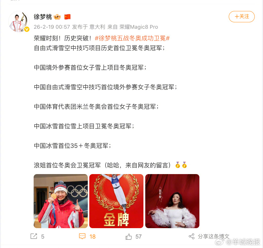 #徐梦桃冬奥卫冕后发文##徐梦桃称是浪姐首位冬奥会卫冕冠军#夺得米兰冬奥会自由式滑雪女子空中技巧金牌,赛后她发博写道: