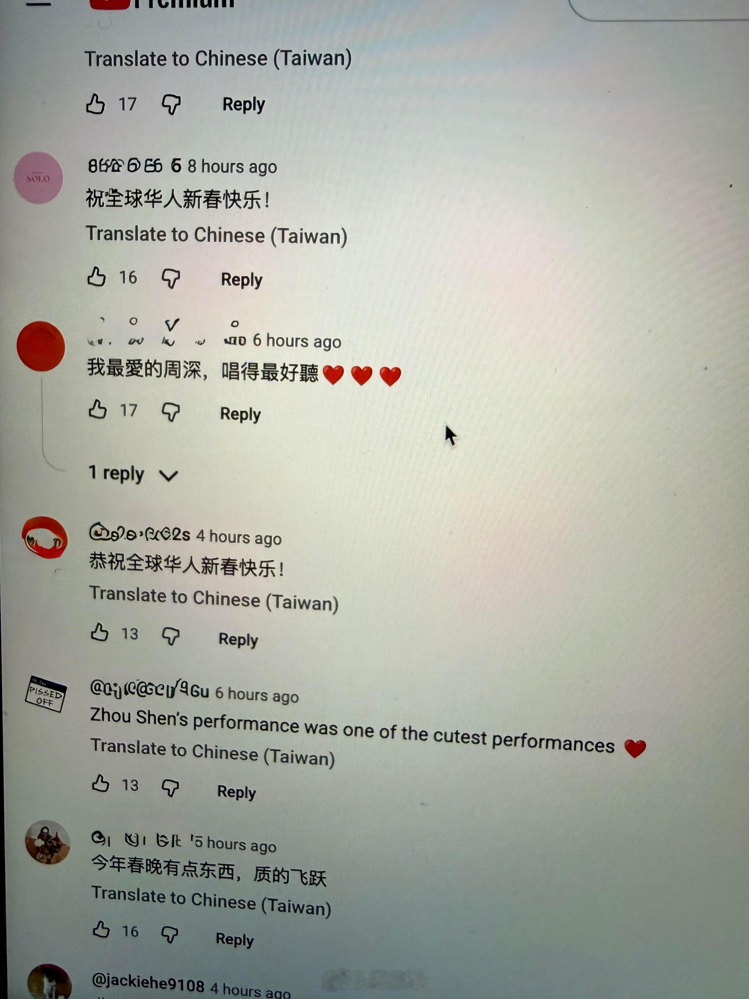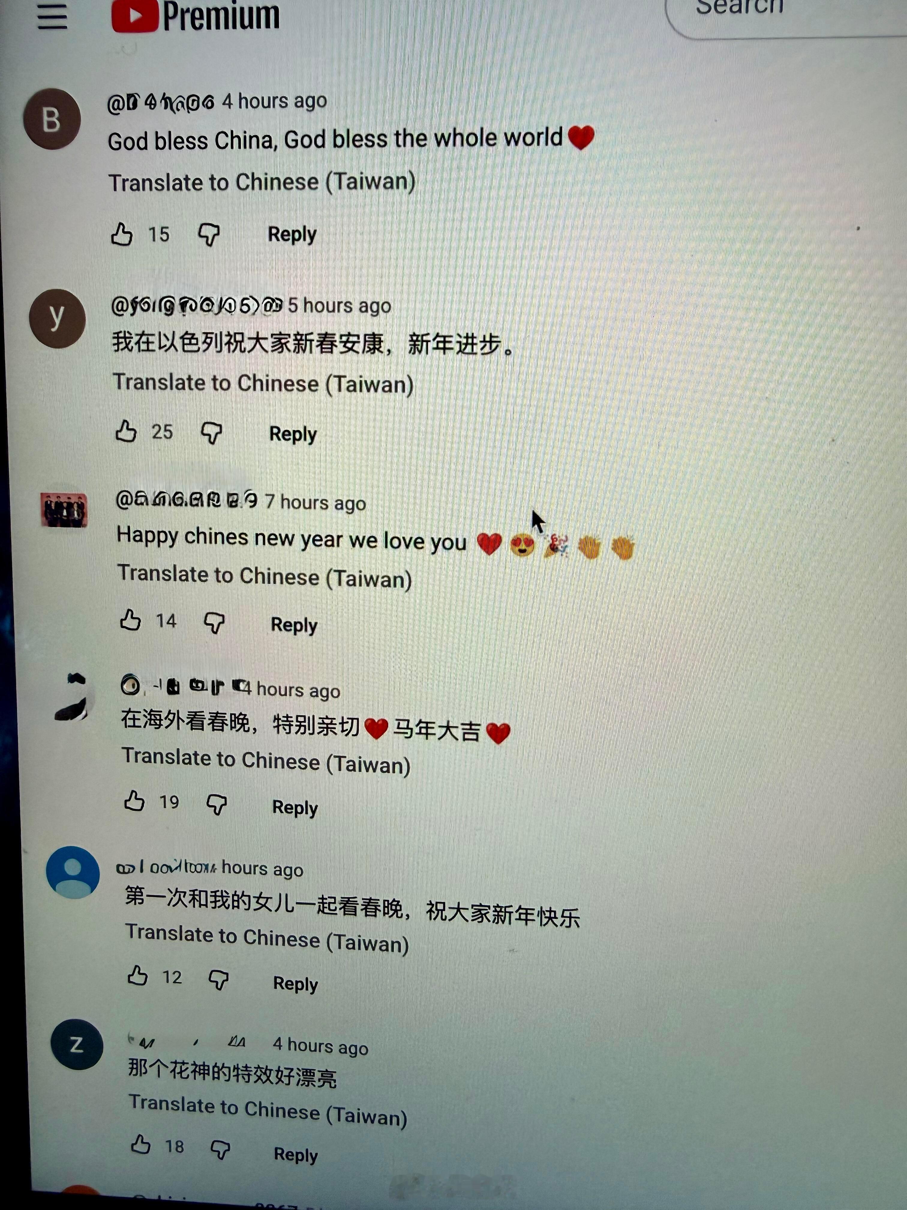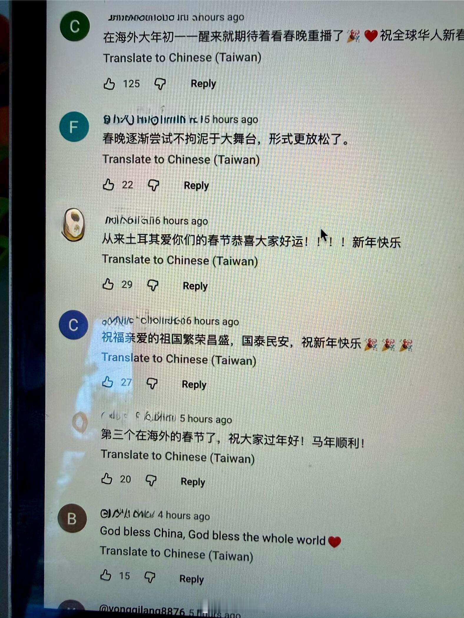 YouTube春晚评论区,几乎全是点赞和祝福,氛围相当和谐。
