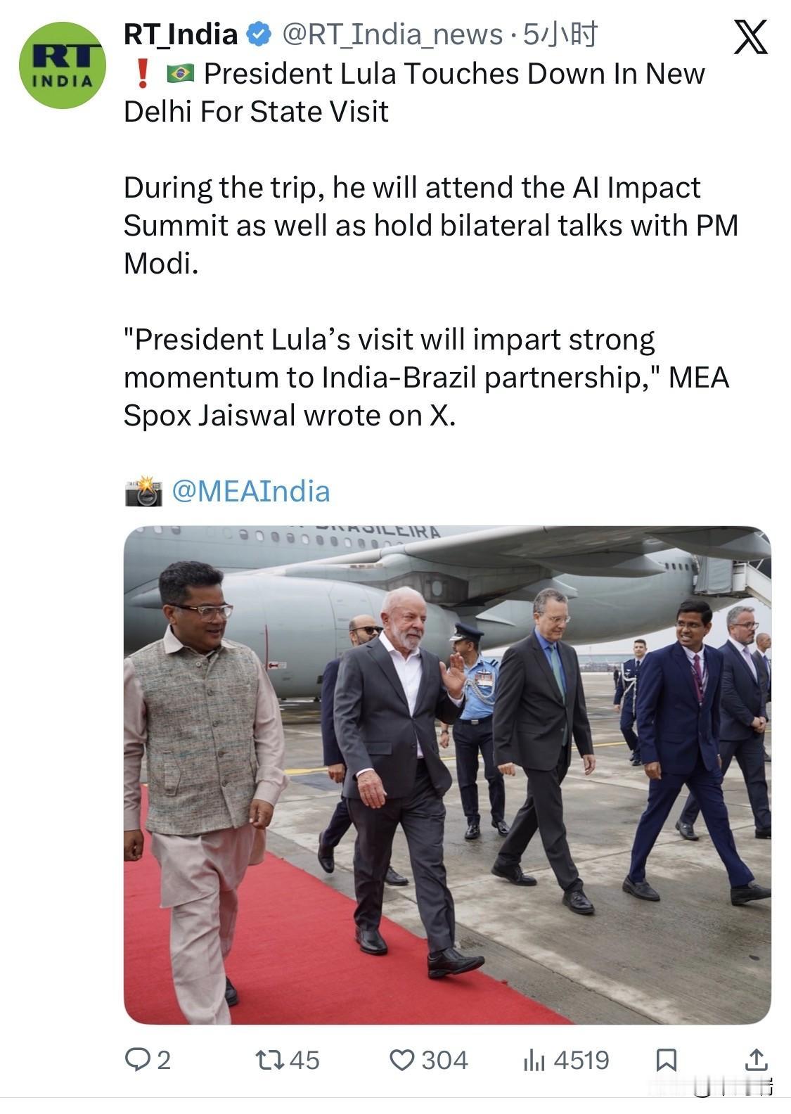巴西总统卢拉(Luiz Inácio Lula da Silva)于 2026年2月18日至22日 对印度进行国事访问。 访问核心议程 双边会晤:卢拉定于 2月21日 与印度总理莫迪举行会谈。双方将回顾战略伙伴关系,并探讨在贸易、国防、能源和关键矿产等领域的合作。 AI全球峰会:卢拉于 2月19日至20日 出席在印度举行的第二届 人工智能影响峰会(AI Impact Summit),这是巴西总统首次参加该领域的全球高级别活动。 庞大代表团:此次访问卢拉率领了由 12名内阁部长 和 超过300名企业家(包括主要生物燃料、科技、航空和国防企业的CEO)组成的代表团,旨在深化经贸联系。 战略目标与背景 贸易额增长:巴印两国重申力争到2030年将双边贸易额提升至 200亿美元(2025年双边贸易额约为152.1亿美元)。 全球南方合作:此次访问发生在印度担任金砖国家轮值主席国期间。双方强调加强“全球南方”国家间的团结,共同应对关税冲击、维护多边主义及推进“去美元化”努力。 后续行程:在结束对印度的访问后,卢拉计划于 2月23日 继续对韩国进行正式访问。