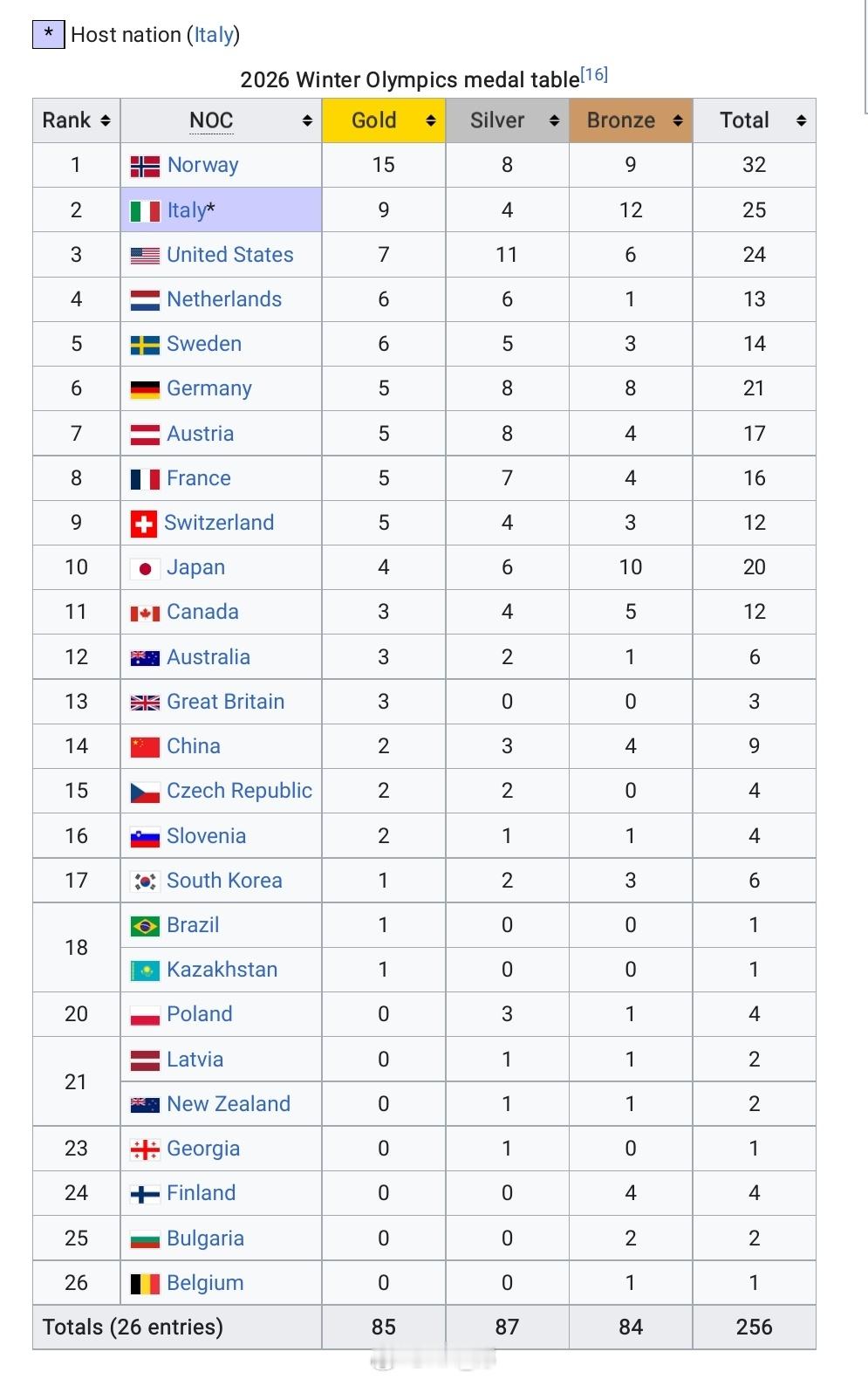 2026年米兰科尔蒂纳冬奥会 即时奥运奖牌榜我们2🥇3🥈4🥉已经来到第14!
