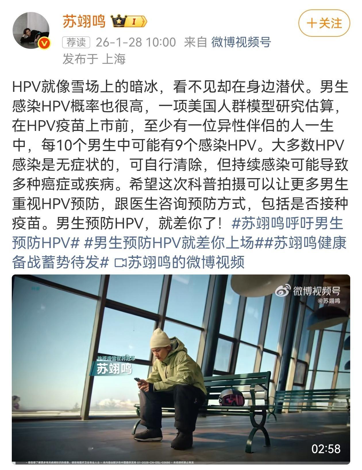 此前,苏翊鸣进行“男生预防HPV”的科普,相关调查以美国人群模型研究进行估算,每10个男生中可能有9个感染HPV。随着苏翊鸣在米兰冬奥会夺冠,更多网友能关注、认识到HPV,同时对真实美国现状,有了更深了解。中国队米兰冬奥首金