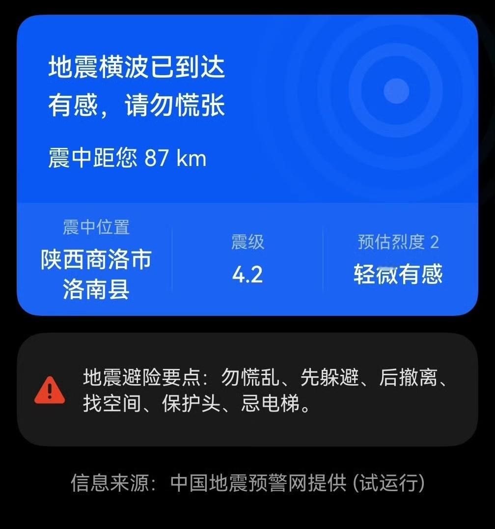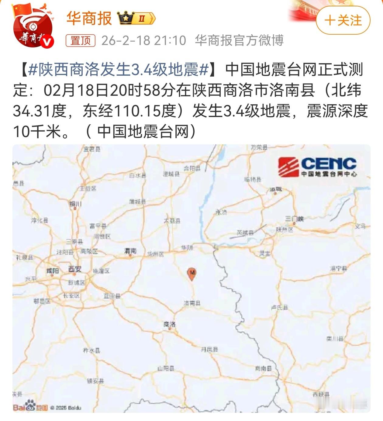 2月18日20时58分,陕西商洛市洛南县,发生3.4级地震,震源深度10千米,西安有明显震感,两地距离100多公里,加之商洛地震的震源深度较浅,导致西安、咸阳等地网友有感受到震动,即便没有震感的网友,手机也收到了地震预警信息。商洛地震西安震感