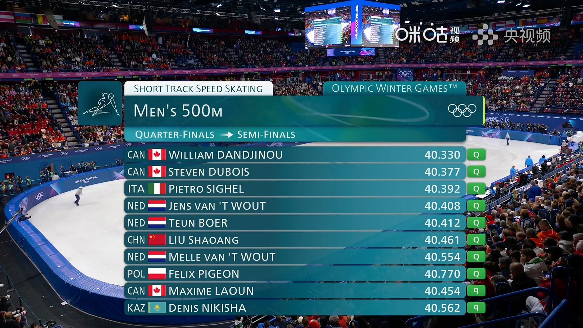米兰冬奥会短道速滑男子500米1/4决赛, 40秒461小组第二顺利晋级半决赛。