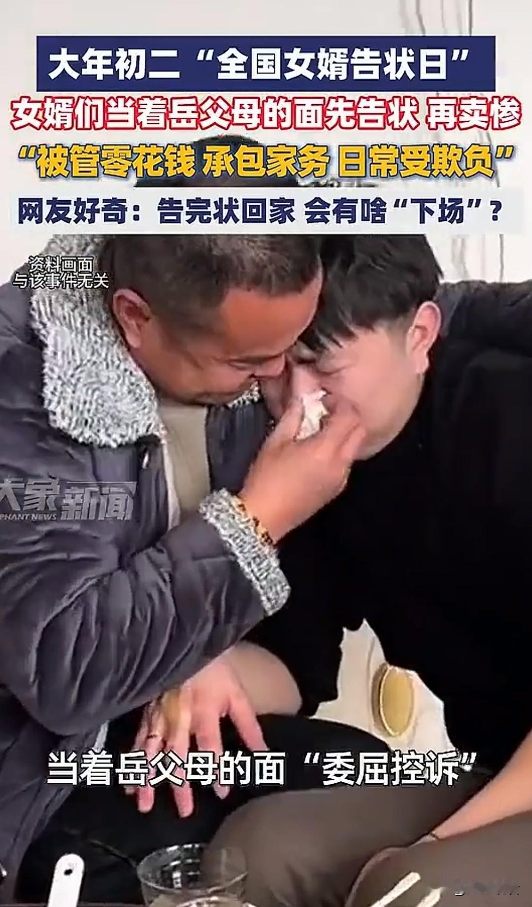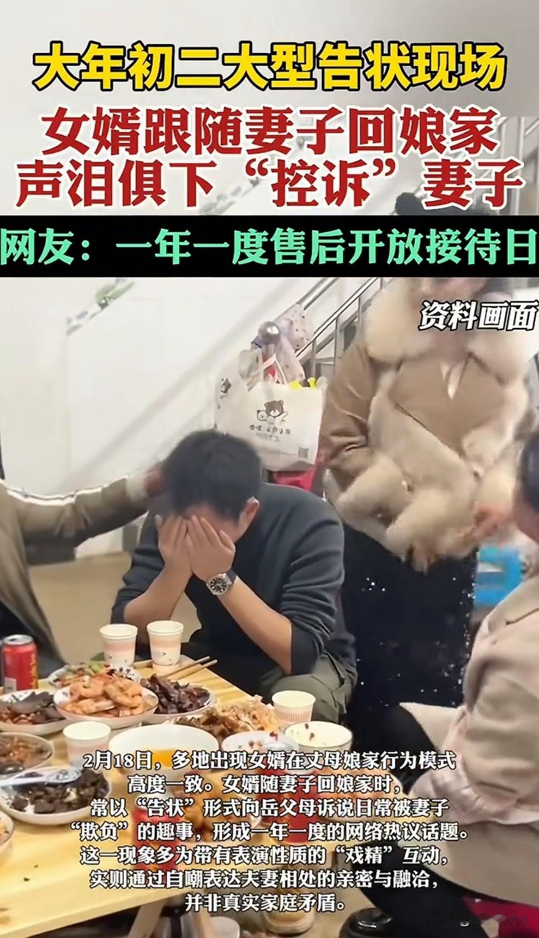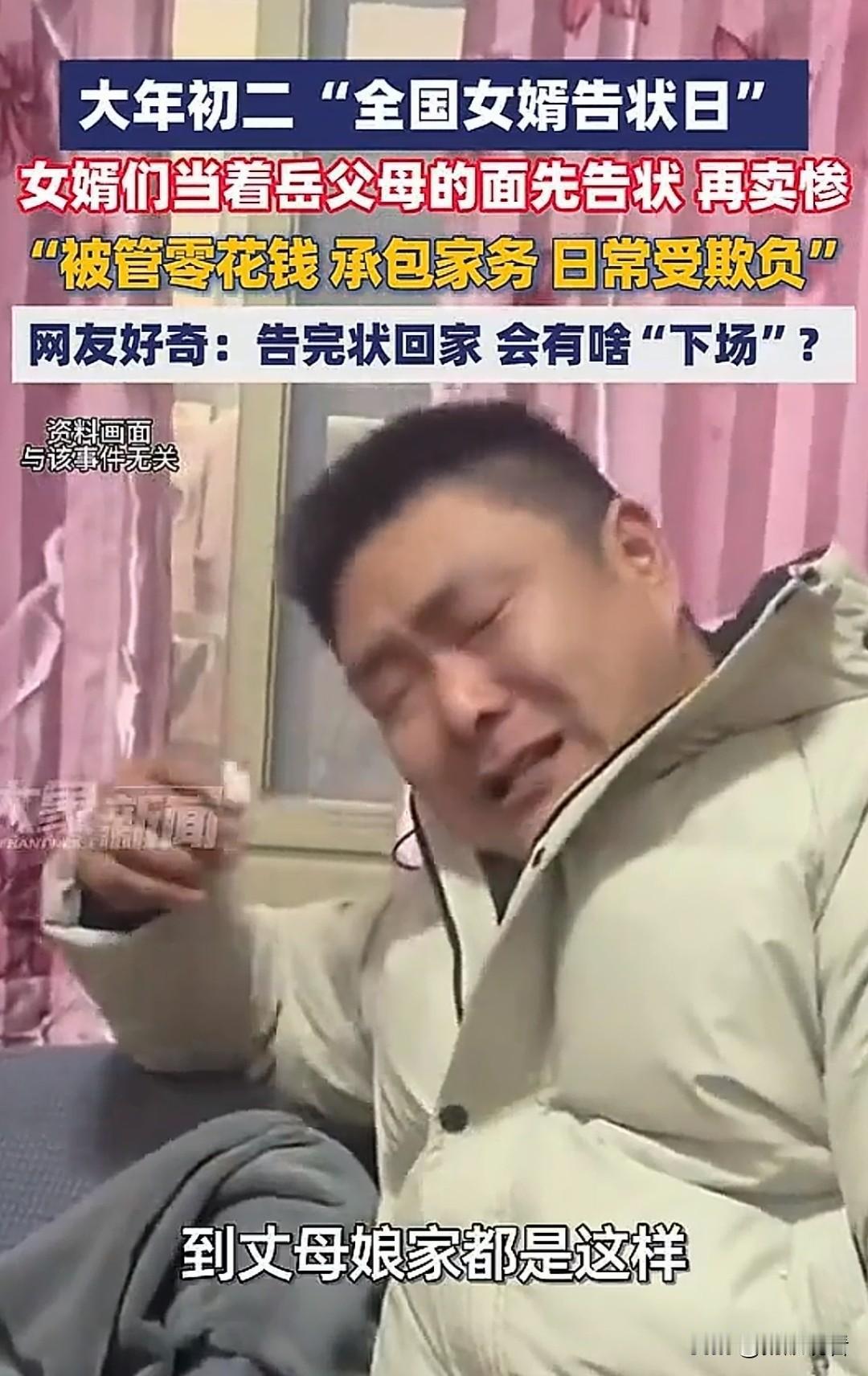 大年初二大型告状现场上线!女婿跟着媳妇回娘家,集体对着岳父母声泪俱下“控诉”老婆,场面又好笑又温馨。网友笑称:一年一度售后开放接待日。 女婿们回娘家统一操作:先告状再卖惨!哭诉零花钱被管、家务全包、日常被“欺负”,戏精演技拉满。网友纷纷好奇:这波操作告完状,回家等着他的会是什么甜蜜“下场”呢? 我觉得其实都是戏精表演,看似告状,实则秀恩爱,满屏都是夫妻和睦、家庭欢乐的氛围。