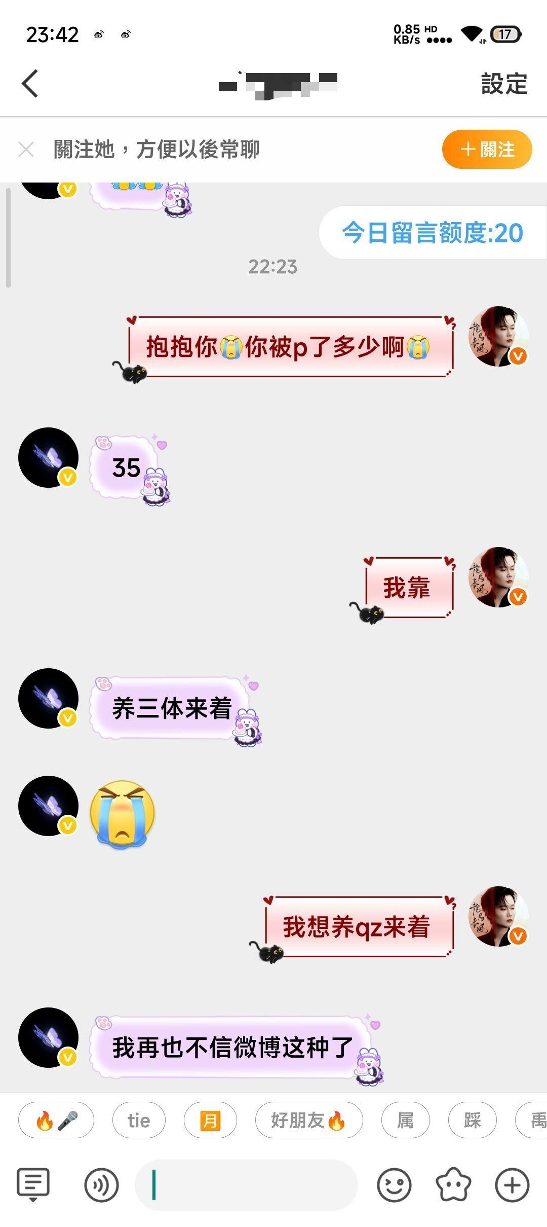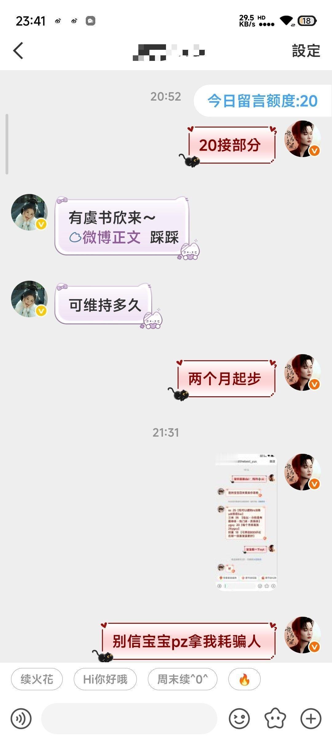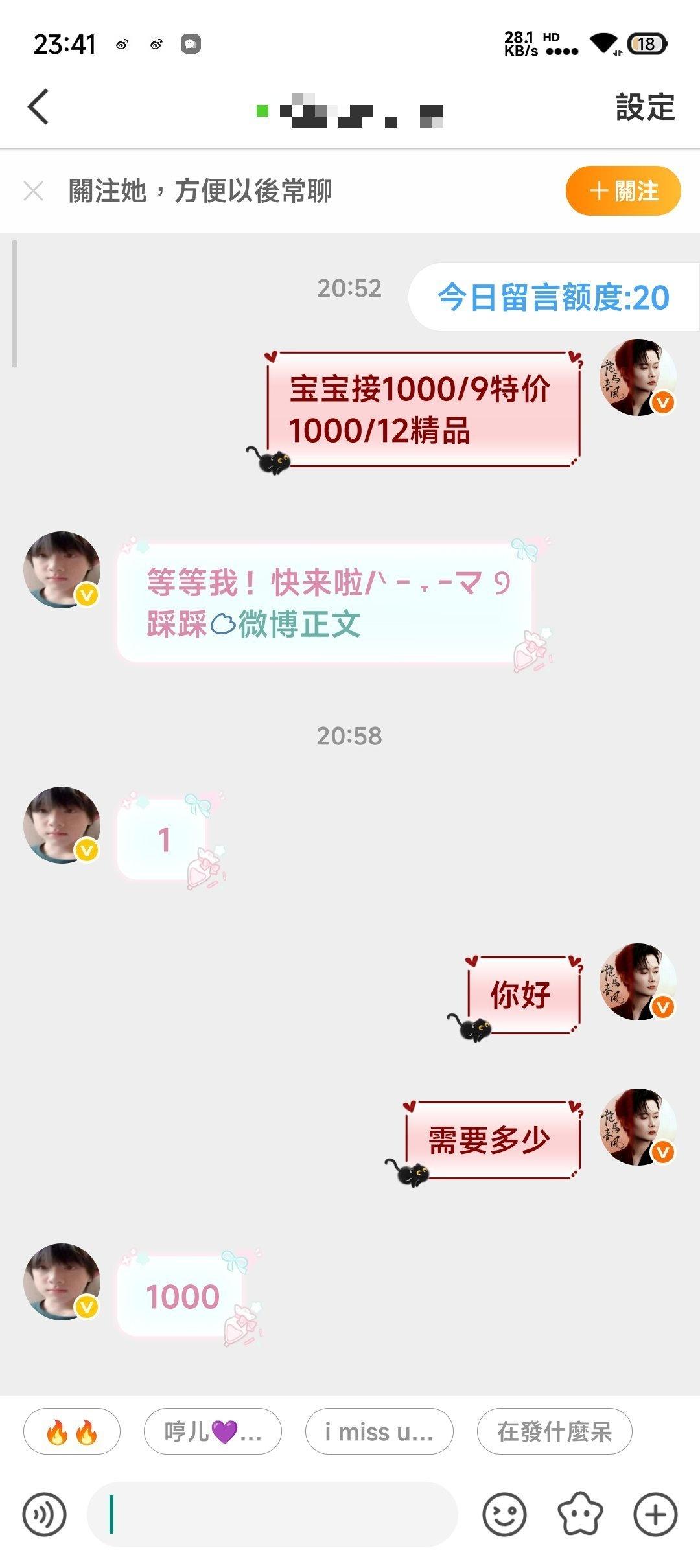 二手超话二手超话 壁垒:Allthebest_yus的主页 帮忙咔一下谢谢你们 你们好我是此耗耗主2.18晚7点多我发了一条在此ch的帖子问代🐑,之后他gz我了我就去问了下➕回g他把➕表发我了我找他要了xyt发了一张特别糊水印都看不起的图我没多想就信了。随后我找他要skm我转过去了(左上角时间是在19:20)随后他把🐴发过来让我sao我sao完也把yzm发过去了他登上了我就没咋管了他ip是在郑州我ip在浙江,我先证明一下我不是pz!!! 后面我出去了就没咋看手机,九点多的时候发现有微博消息点开一看越看越不对劲,发现他在用我耗骗人,吓得我马上取消denglu权限了后面之后找他们解释,有些被我及时止损了还有的宝宝被p了我目前知道的两个一个被pian35🥕一个被pian30🥕,他还把我和他的聊天记录全清完并且互取,进行一系列的zp我估计聊天记录全没的估计都已经被pian了(应该是一jiaoyi完就清空聊天记录)真的很对不起(我当时fu完的时候问他v他说🥚太多pf了) 不仅把我在此ch里的帖全清了还把我的博给编辑设置仅自己可见我给他发消息也不理我但是我也不知道他赞我微博几个意思 (前面几张截图有是因为我当时不太放心就截了几个发朋友了结果成了我自证自己不是骗子的图)pz替我们挡霉运替我们挡灾!祝大家新年快乐万事顺利