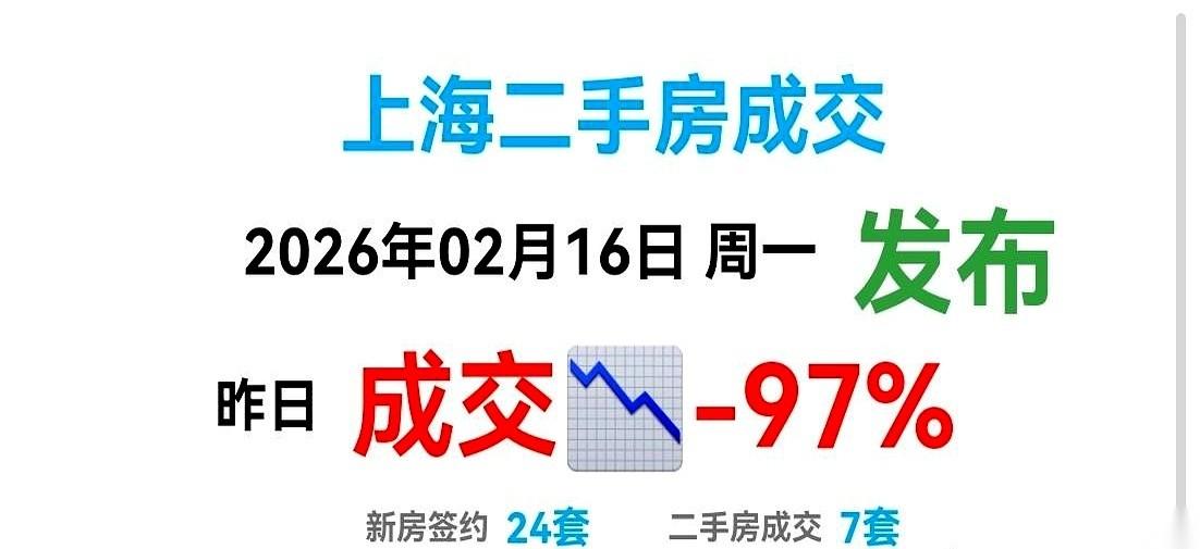 我揉了揉眼,以为自己看错了。 昨天,周日。 两千多万人的上海,二手房成交量,7套。 你没看错,我也没打错,就是个位数,7。 前一天这个数字还是194,一夜之间,跌了96%,直接给你干到了脚脖子底下。 什么叫冰封,这就叫冰封。 更恐怖的是什么? 是现在挂在网上,等着卖的房子,有32万多套。 32万个家庭在焦急地等,等一天,等来了7个买家。 这概率,597比1。 将近六百个人排队卖房,只有一个人能成交,剩下的五百九十九位,明天请早。 按这个速度卖下去,不清库存,要整整20个月。 别说二手了,新房昨天也只网签了24套。 整个大上海,新房二手加一块,31套。 真的,有时候数据比任何话都扎心。 它不会骗人,也不会安慰你。 最近想卖房的朋友,可能真的,得把预期放到最低最低,然后……沉住气。