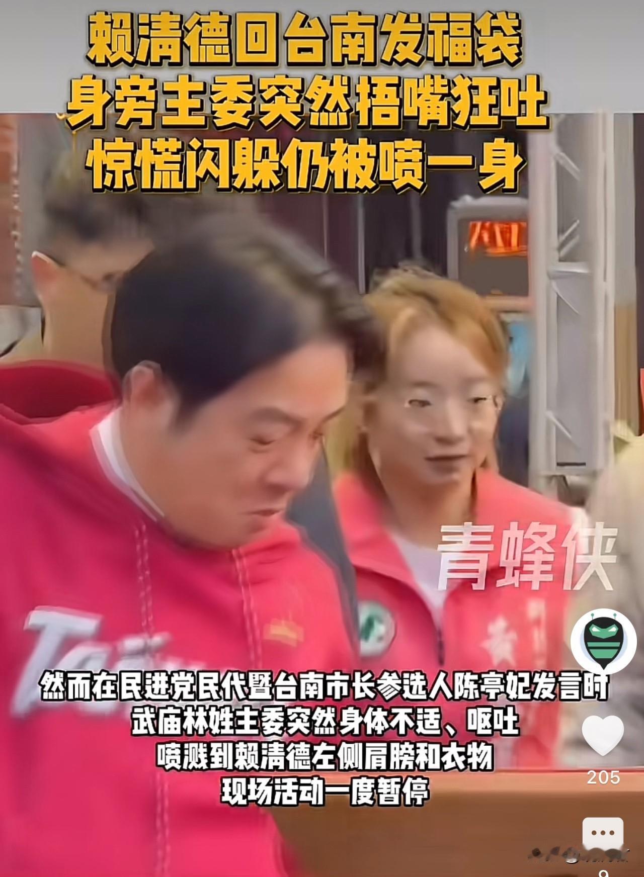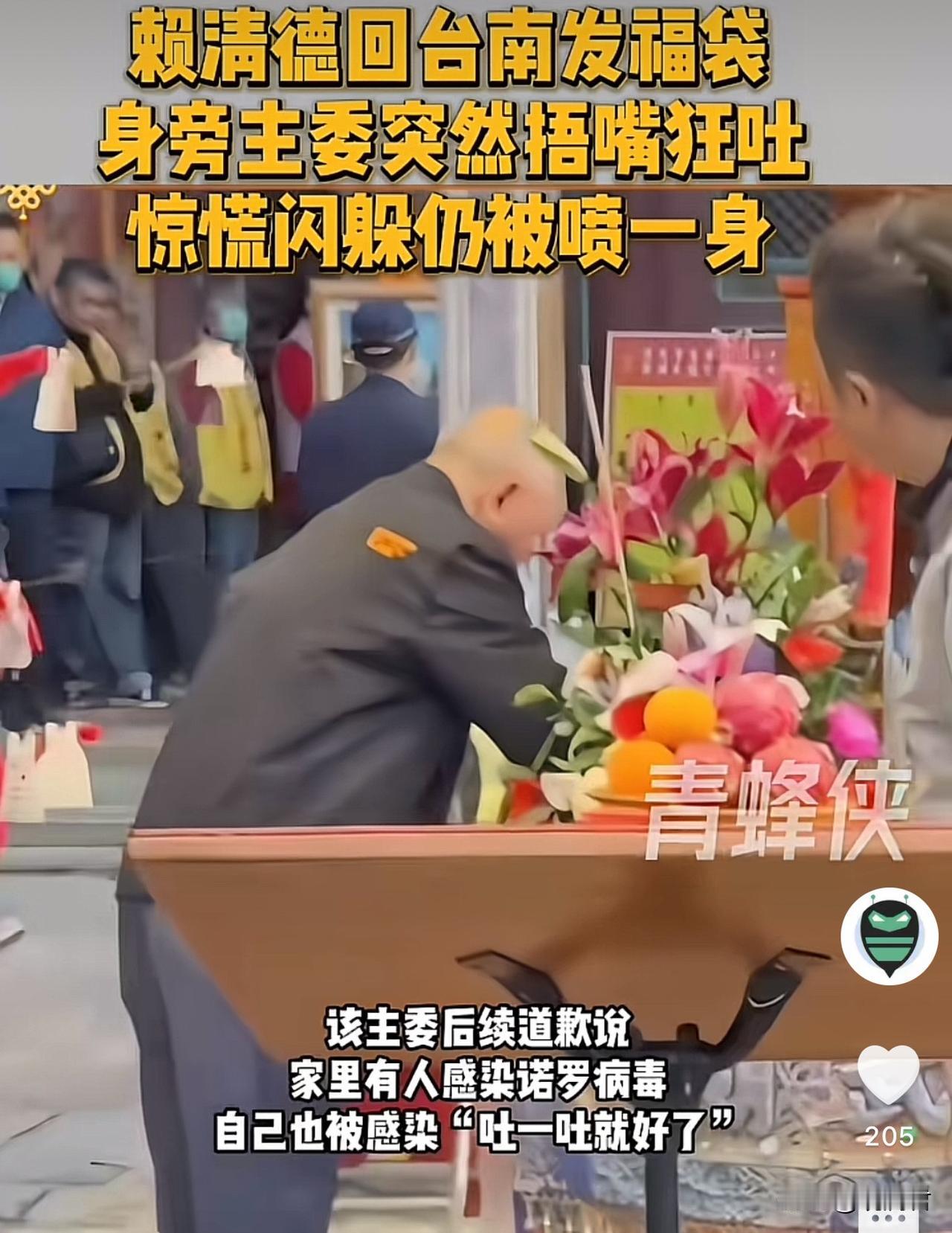 2月18号.身穿艳丽红衣的赖清德绝对想不到,大吉大利的新春佳节,参加新年祈福活动,本来想讨个好兆头,却没曾想被身旁老汉意外的喷溅到了“病毒”秽物。 事情的起因是,当天与赖清德并排参加活动的老汉突然发生呕吐,虽用手掩嘴,但呕吐物仍然猝不及防的喷溅到身旁的赖清德身上。 活动一度中断。 事后,老汉道歉,家里有人感染诺罗病毒,自己也被感染。“吐一吐就好了”。