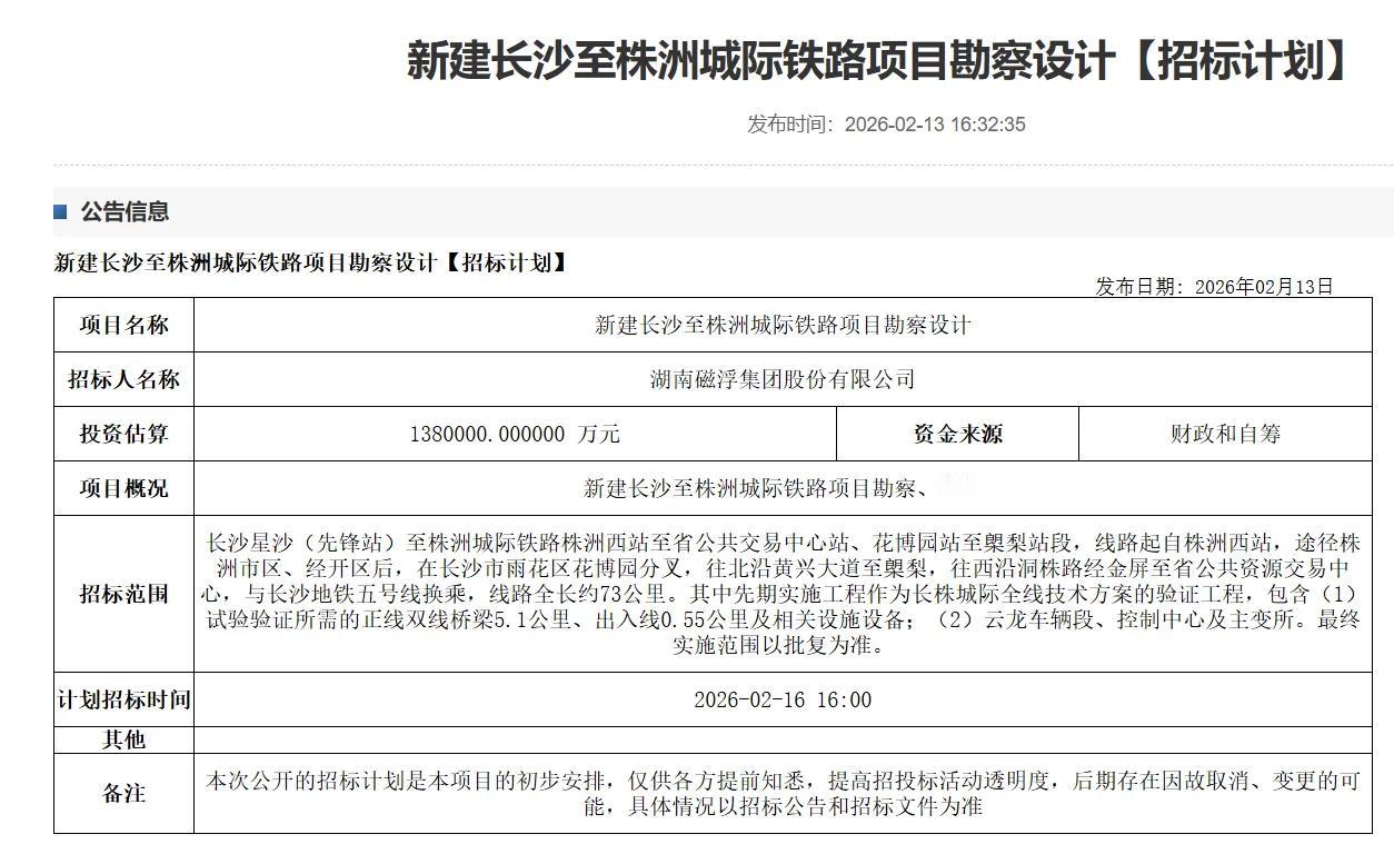2026年2月13日,长沙市公共资源交易中心发布新建长沙至株洲城际铁路(长株磁浮/S4线)勘察设计招标计划,明确2月16日正式启动招标,标志着这一融城重大工程由规划阶段转入实质性推进周期。 项目线路全长约73公里,起于株洲西站,途经株洲主城区、经开区,向北进入长沙雨花区花博园站后分为两支:北线沿黄兴大道至㮾梨,覆盖长沙县核心片区;西线沿洞株路向西,终到省公共资源交易中心站,可与长沙地铁5号线无缝换乘。 为保障技术成熟与建设效率,项目同步推进先期实施工程,作为全线技术验证段:建设正线双线桥梁5.1公里、出入线0.55公里,同步新建云龙车辆段、控制中心、主变所三大核心配套,为全线建设奠定基础。 长株磁浮采用磁浮制式,衔接高铁枢纽与城市地铁网络,覆盖长株两地核心居住与产业板块,将大幅提升跨城通勤效率,完善长株潭“三干两轨四连线”立体交通体系,助力长株潭都市圈一体化提速。 最终线路与建设范围以官方批复为准。