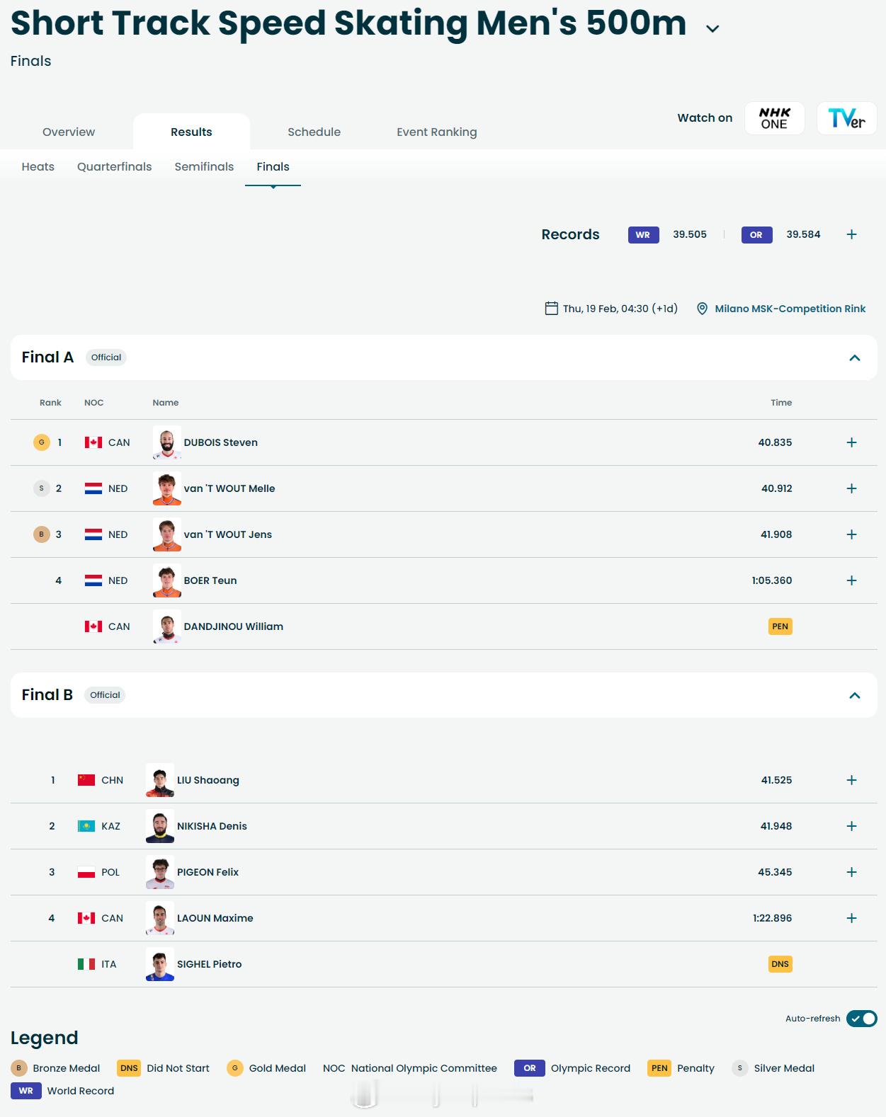 【冬奥短道速滑男子500米加拿大杜博瓦夺冠】 短道速滑冬奥会 2月18日,冬奥会短道速滑男子500米比赛结束,加拿大选手杜博瓦以40秒835夺得金牌,荷兰M-范特乌特和J-范特乌特分获银铜牌。刘少昂获得B组第一,林孝埈在1/4决赛中排名小组第四无缘半决赛。