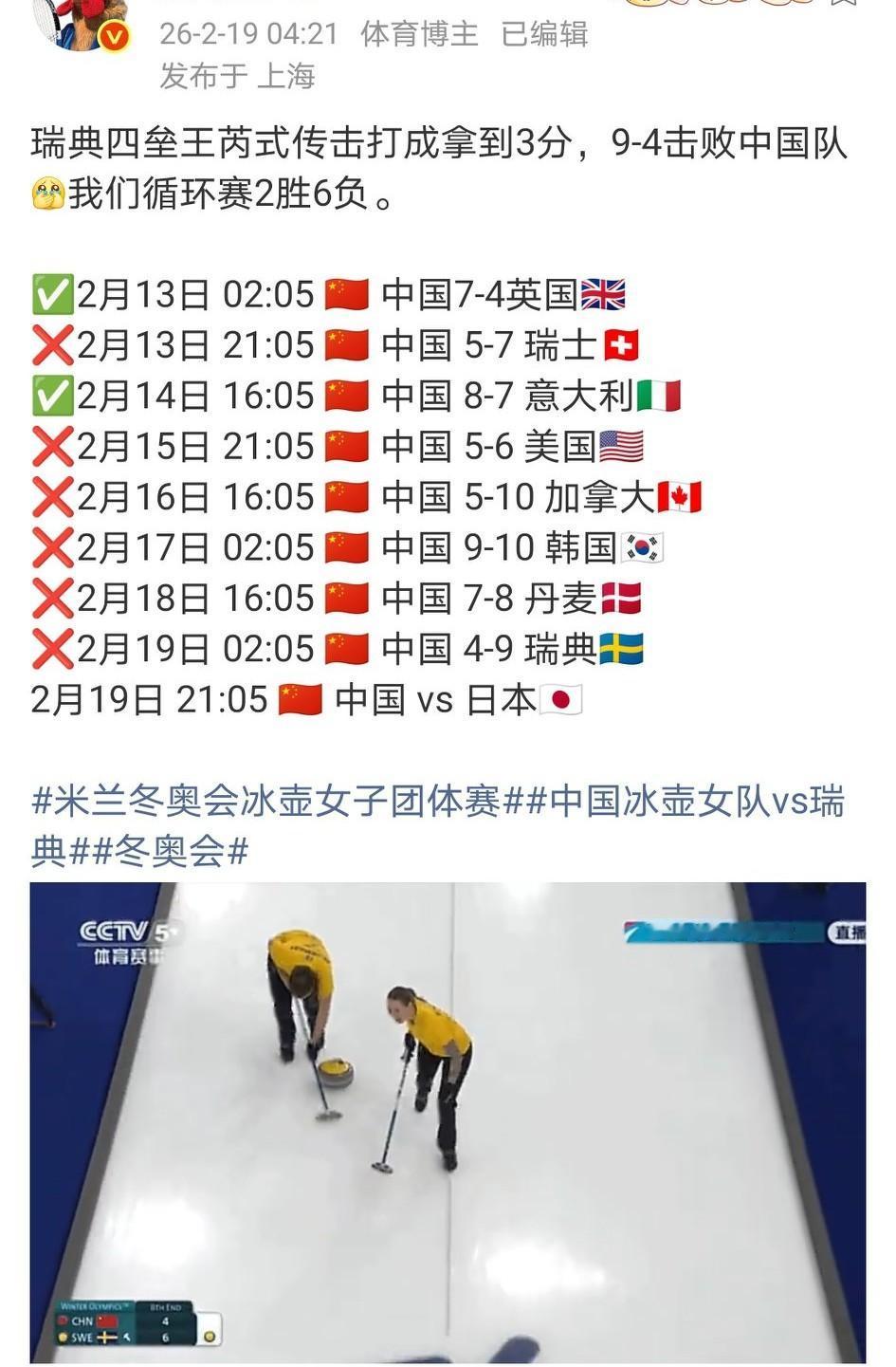对冰壶已经心如止水了,中国女壶又输了,目前战绩2胜6负,最后一轮对阵日本,荣誉之战! 米兰冬奥会冰壶女子循环赛,中国4-9瑞典。