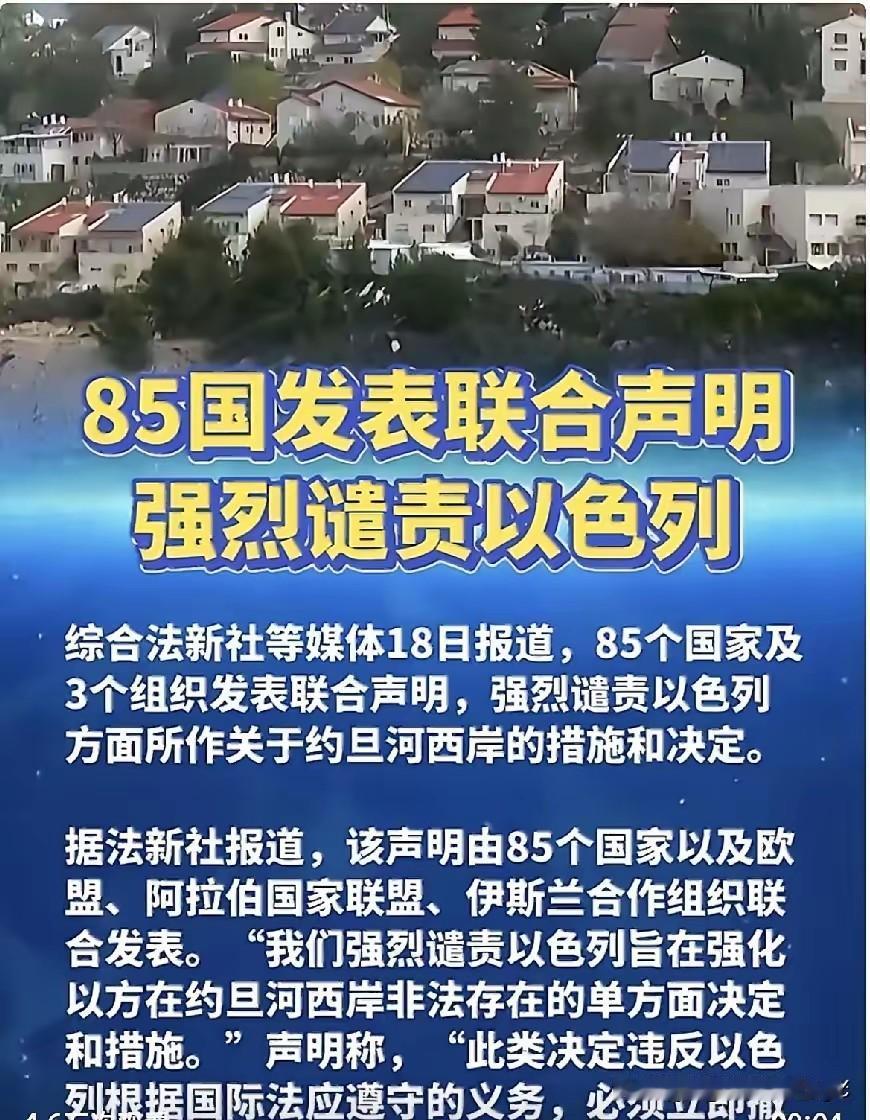 根据多家外媒2月18日报道,85个国家在联合国联合发表声明,强烈谴责以色列旨在扩大其在约旦河西岸“非法存在”的单边措施 。 导火索是2月15日那纸决定,以色列内阁拍板了新的土地登记程序,要把约旦河西岸大片土地划成“国有”。这一步,明眼人都看得出,是往吞并的路上迈。 声明里说得斩钉截铁:这违反国际法,必须马上撤回去。85国站成一排,沙特、中国、俄罗斯、法国、德国都在其中。欧盟、阿拉伯国家联盟、伊斯兰合作组织也凑了进来,等于大半个世界递了张反对票。 “坚决反对象征性吞并”,这话不是吓唬人,是把规矩亮在了台面上。联合国秘书长古特雷斯也开了口,直斥这措施“破坏稳定又违法”,逼着以色列赶紧收手。 可内塔尼亚胡刚从美国回来,就敢动这一步,谁都能品出点味道——怕是得了默许,甚至授权?约旦河西岸的事,造成了巴以关系的死结。内塔尼亚胡在这儿建定居点的心思,藏了不是一天两天。 这次借着土地登记动手,等于把多年的预谋摆上了台面。国际社会骂声一片,他会听吗?悬。说到底,以色列的底气,多半看美国的脸色。只要华盛顿不明确说“不”,内塔尼亚胡怕是要一条道走到黑。 这就像孩子闯了祸,只要家长不瞪眼,胆子只会越来越大。加沙地带的局势本就紧绷,约旦河西岸再这么一闹,巴以的火药桶离炸更近了。巴勒斯坦人世代居住的土地,凭什么说划就划? 国际法讲的是主权平等,不是谁拳头硬谁就能圈地。85国的齐声反对,不只是为了巴勒斯坦,更是为了守住国际秩序的底线。今天以色列能在约旦河西岸搞特殊,明天其他地方是不是也能有样学样? 国与国的边界,哪能成了说改就改的橡皮筋?阿拉伯国家联盟的加入,透着股无奈。自家门口的土地被人占了,再不吭声,脸往哪搁?伊斯兰合作组织的态度更直接——宗教与土地绑在一块儿,哪容得外人随便动? 欧盟的法国、德国也表了态,说明这事连西方内部都吵翻了。国际法不是美国一家定的规矩,谁也不能搞例外。可内塔尼亚胡怕是铁了心,访美回来就动手,时间掐得这么准,背后没点默契说不过去。 以色列仗着有靠山,在中东横了不是一天,这次想把“非法存在”变合法,如意算盘打得噼啪响。只是这世界,终究不是谁一家说了算。85国的声明,是给以色列提个醒:再一意孤行,只会把自己架在火上烤。 约旦河西岸的土地上,埋着巴勒斯坦人的祖坟,长着他们的庄稼,不是几张纸就能抢走的。古特雷斯的呼吁,更像句警告。联合国的桌子上,摆的是公理,不是强权。以色列要是非要往枪口上撞,最后只会引火烧身。 巴以的和平,本就像沙漠里的花,难开得很。现在这么一折腾,怕是连花苗都要被踩烂。85国的反对声里,藏着多少国家的担忧——这事儿开了头,以后的乱子只会更多。 说到底,土地不是蛋糕,不能谁想切就切。国际法不是摆设,犯了规矩就得认账。内塔尼亚胡要是真敢不听劝,那85国的声音,迟早会变成更实在的行动。约旦河西岸的风,该吹醒装睡的人了。