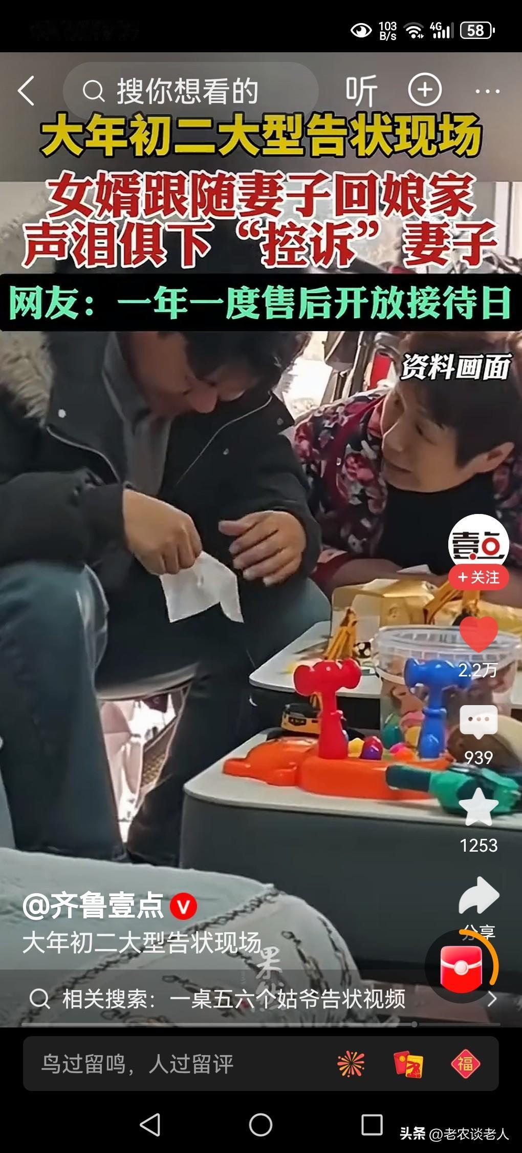 大年初二大型“告状现场”! 这句话听起来确实很有画面感!真的是“告状”吗?其实是夫妻感情的一种升华,亲情的一种增进方式。 每一年的大年初二,是传统习俗丈夫陪妻子“回娘家”的日子,是出嫁的女儿会带着丈夫和孩子回娘家给父母拜年。 当一大家子人欢欢喜喜,其乐融融地团聚在一起的时候,岳父岳母总会“献殷情”地询问女婿、女儿和孩子,有没有“欺负”和“不平”的现象,确实很容易变成各种吐槽和“告状”的现场。 一般情况下,这种“大型告状现场”的型式有以下五种方式: ①妻子的“诉状”:借机向娘家父母“告状”,诉说丈夫一年来的“罪行”。 ②孩子的“状词”:孩子可能是最积极的“原告”,当着全家人的面揭发父母的“罪行”。 ③女婿的“尴尬”:作为女婿,这时就成了众矢之的,只能一边陪笑,一边给岳父岳母敬酒,试图堵住老婆的嘴。 ④亲戚的“助攻”:七大姑八大姨也闲不住,帮着举证。 ⑤父母的“调解”:作为“首席大法官”,父母会象征性地批评自己的女儿或女婿几句。 这种“告状”看似是在吐槽,实际上是一种热闹的互动,带着玩笑和亲昵在“煽情”,表达夫妻之间情感的甜蜜,关系的融洽,所有的“替台词”,都不是家庭的真实矛盾,是展现一家人不见外的亲密感。如果你们家也有这样的场景,那说明这个年,将过得热热闹闹、亲情正浓。你怎么看?