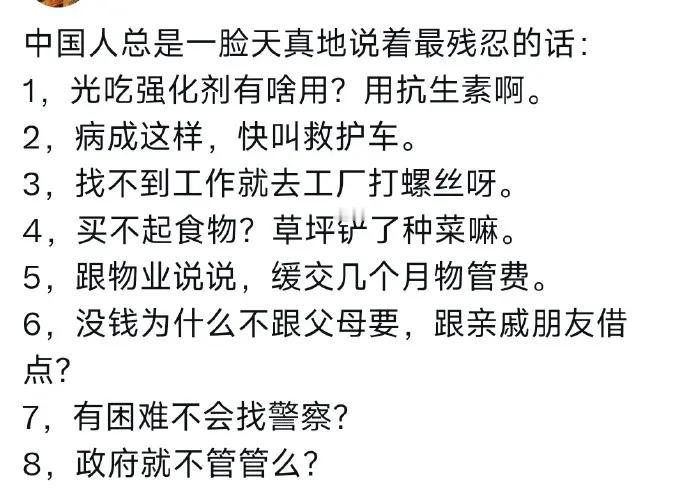 中国人天真的对着美国人说着最残忍的话。战壕的一个帖子居然展现量22万。这说明这样一个简单的话题引起了网友共情。 其实,这里有个东西方文化差异的问题。别的不说,就说铲了草坪种菜这事,这是咱们的共识。但是在他们那里宁可吃不上菜(他们没有像咱们这样炒菜的)也不会铲了草坪种菜。 还有,一般的感冒发烧去了医院,大夫也是让回家物理降温、喝水,根本就不会给开药,说起抗生素就和你不要想了。如果说输液吊瓶,那就相当于做一次小手术。 至于说,没钱跟父母要,那就更不可理解了,孩子18岁就完全独立,在父母家里住都需要缴纳租金,更别说张口要钱了,肯借给孩子不要利息就烧高香了。根本就没有啃老这个说法。当然了,做子女的也没有赡养老人的义务的。所以说,咱们说的最残忍的话,他们根本就听不懂的。