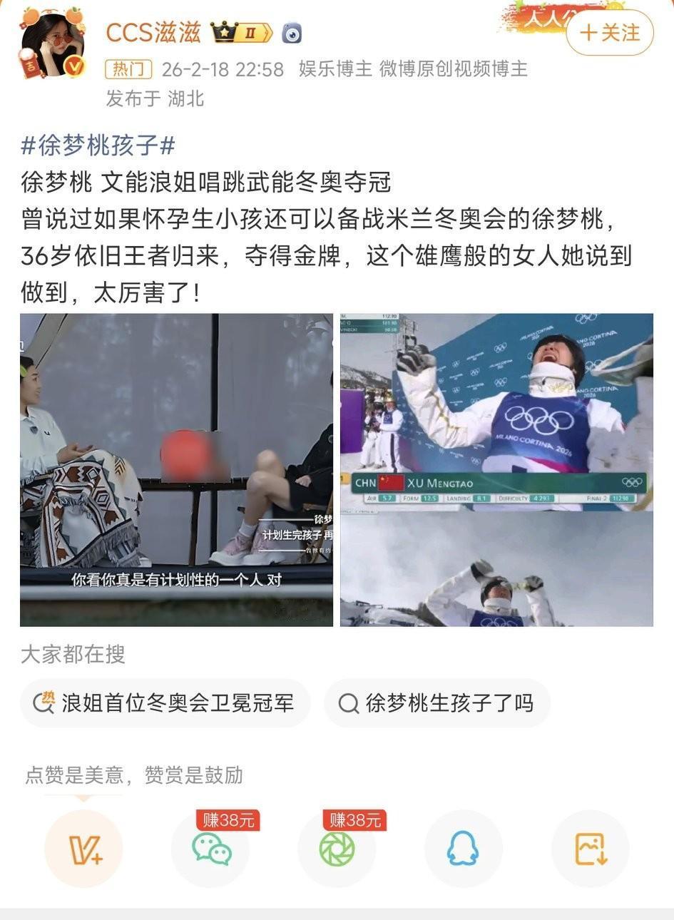 徐梦桃生完孩子当了妈,还能重回冬奥赛场,甚至成功卫冕拿下金牌,这件事太了不起了,最近网上特别火,大家都在聊。 之前有好几个账号,比如“一份篮球”等,都发过徐梦桃生完孩子就备战奥运的内容,结果不少网友出来反驳。 还有个带官方认证的账号“视觉颜究生”,说得很明白,目前公开能查到的信息里,徐梦桃根本就没有生孩子,并且她本人从来没有官宣过自己生子的消息。 部分网友质疑,相关话题把焦点放在徐梦桃和孩子身上,偏离了对运动员本身的关注,认为女性的成功必须要绑定“妈妈”这种家庭身份。 还有网友说,有没有孩子,对徐梦桃的冠军都没有影响。如果她有孩子,我更加敬佩;如果没有,我希望她以后能如愿做妈妈。 跟大家说个明白,网上传的“徐梦桃生完孩子复出拿冬奥冠军”全是假的。 徐梦桃透露到现在都还没生过孩子。她本来有备孕的打算,可因为要全力拼2026年米兰冬奥会,就把备孕的事往后推了。这次她是36岁、还没生育的状态,成功卫冕了自由式滑雪空中技巧的奥运金牌,还是这个项目有史以来,第一个能连着拿两届奥运冠军的选手,特别厉害。 她早就给以后要生的宝宝想好名字了,叫“小核桃”,还打算等孩子1岁的时候,就带他接触滑雪,但不会硬逼孩子,全看孩子自己有没有兴趣,顺着孩子的性子来引导。 徐梦桃妈妈王凤丽的教育想法:孩子做什么选择都尊重,把安全放在第一位,不逼着孩子非得做到完美,不拿孩子跟别人攀比,就安安心心当孩子最靠谱的靠山。 我认为适合自己的路才是最好的,徐梦桃把这句话活成了人生写照。所以希望大家不传谣、不信谣。无论徐梦桃生没生过孩子,她都是成功的女人,大家觉得呢?