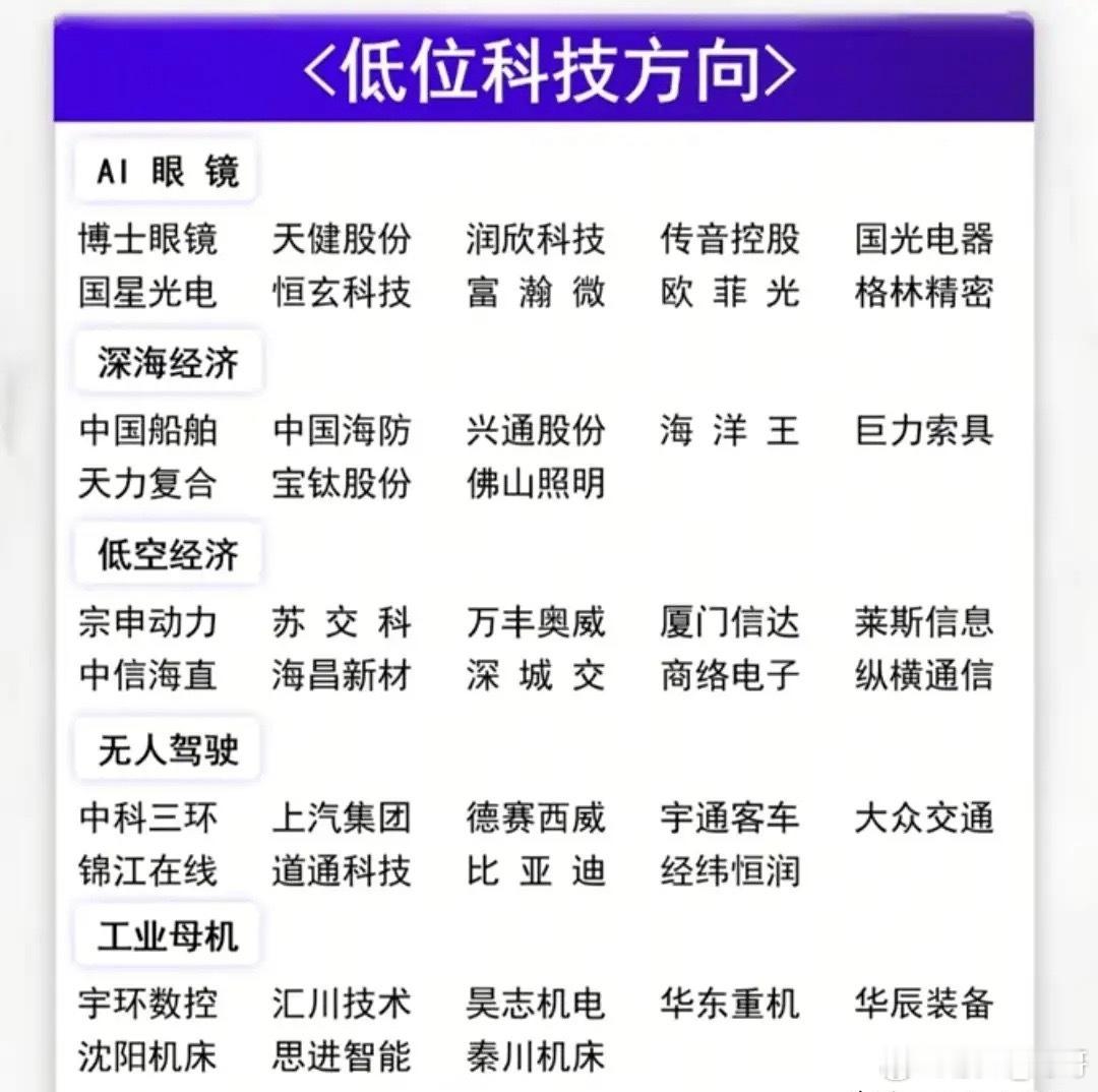 低位科技龙头代表:AI眼镜龙头恒玄科技、低空经济龙头万丰奥威、无人驾驶龙头德赛西威、工业母机龙头华东重机……