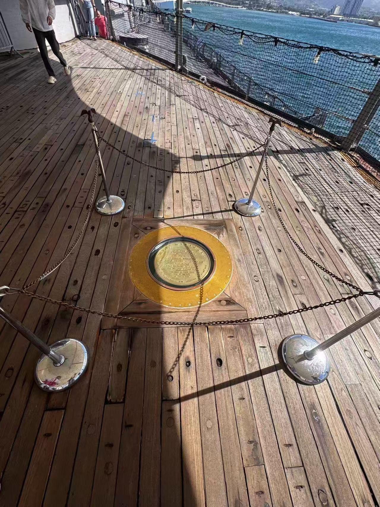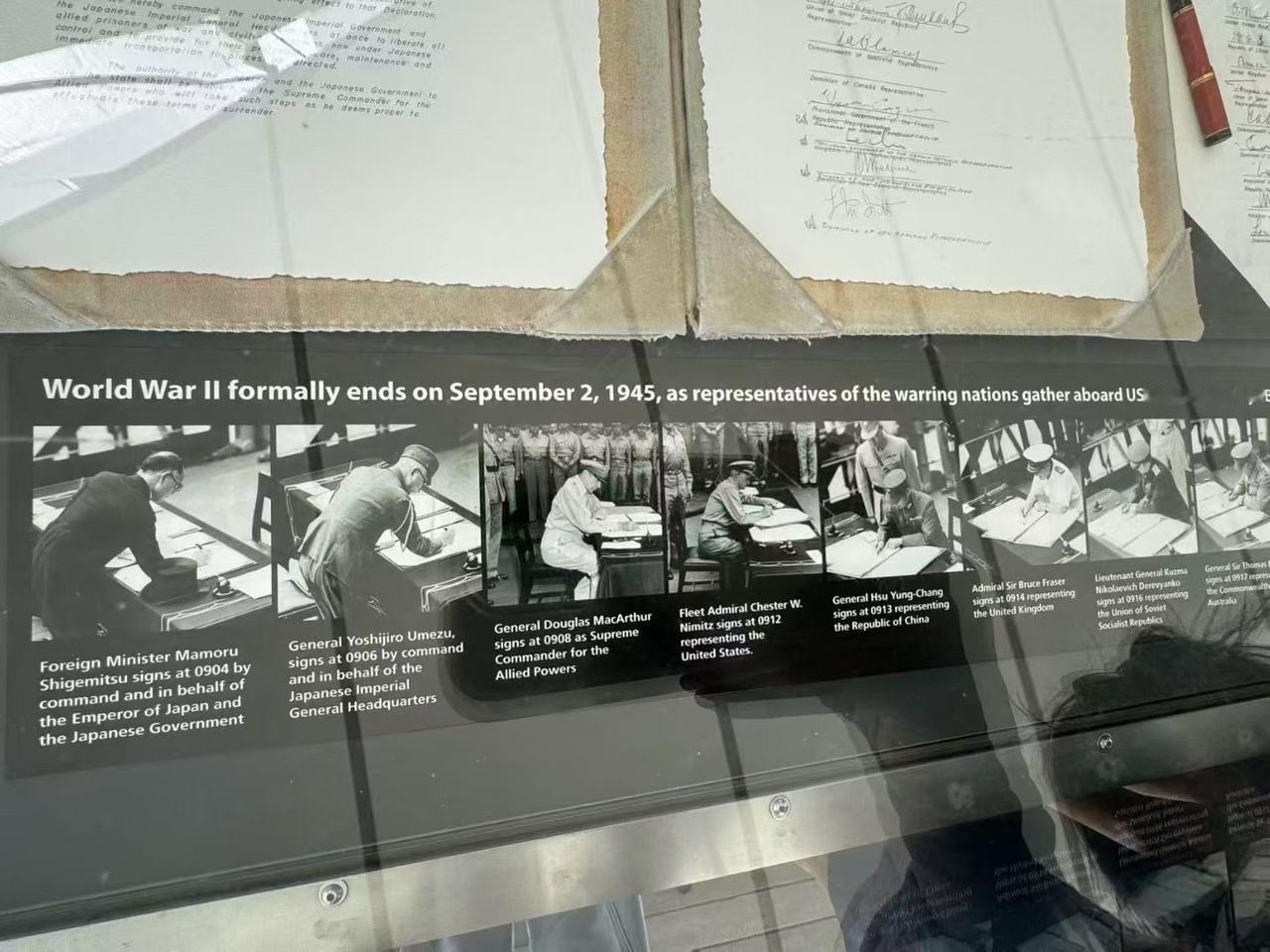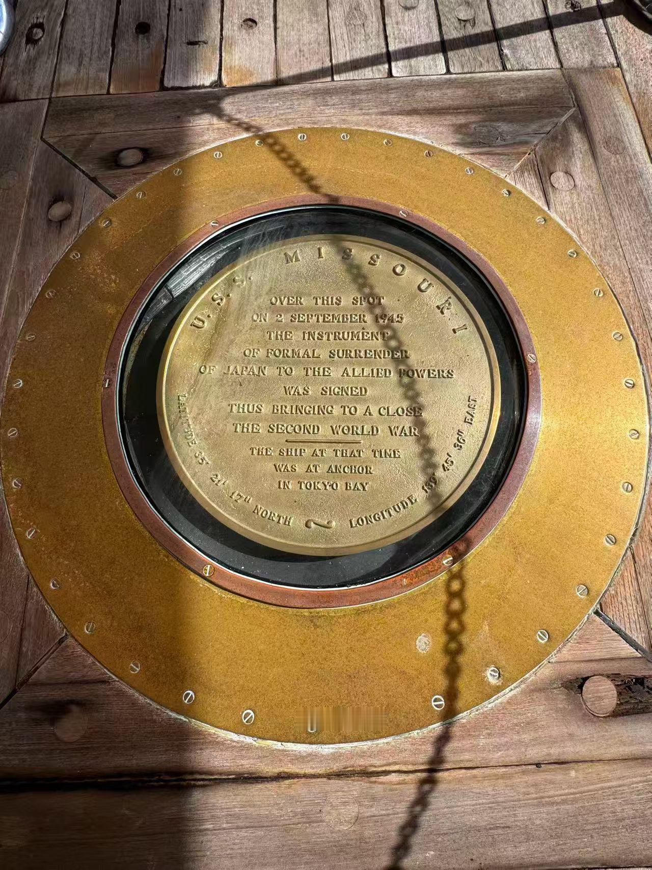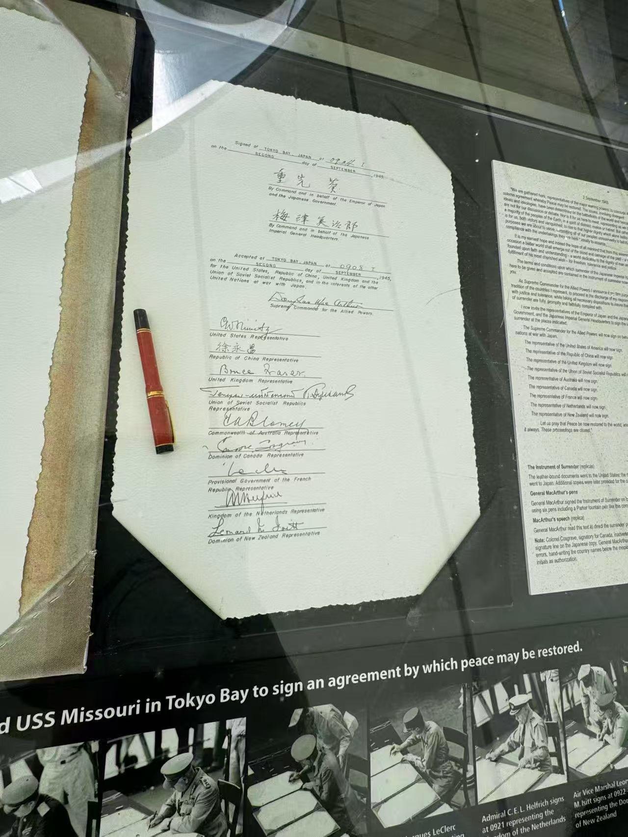 Menstravinsky: 作为一个中国人,站在密苏里号战列舰的甲板上完成对那段历史的一份凭吊是我长久以来的心愿。 1945年9月2日,日本在此签署投降书。此刻,我站在那个历史性的点位,这份投降书就在眼前,一些细节耐人寻味。它一式两份,盟军版工整无瑕,日方保管的那份却因加拿大代表科斯格雷夫单目失明视线不佳签错了行,留下了明显的涂改痕迹。尽管日方当场抗议,却也只能接受这份带有瑕疵的历史判决。 当时在场的《大公报》记者朱启平后来写到,“倒霉的日本人,连份投降书也不是干干净净的。”这仿佛是历史的某种隐喻。盟军代表签字的顺序严格遵循着盟国在反法西斯战争中的牺牲与贡献,中国代表徐永昌位列第二。 这个位置,是3500万中国军民——其中九成以上是平民——用血肉之躯换来的。当时,密苏里号停泊在东京湾的位置距离东京市中心约30-40公里,恰好在其主炮射程之内(37公里); 对此,有一个未经官方证实、仅在坊间流传的猜测:密苏里号停在此处,是为了应对日本当场反悔,可以随时开火。无论如何,这个安排确实完全符合战胜国的威慑心理:将受降仪式安排在战列舰上,炮口对准东京。这种威慑的意象完全契合战胜国当时的心态:这场仪式不仅是为了接受投降,更是为了确保和平不再被践踏。密苏里号已于1992年退役,现停泊在夏威夷珍珠港。密苏里号投降书