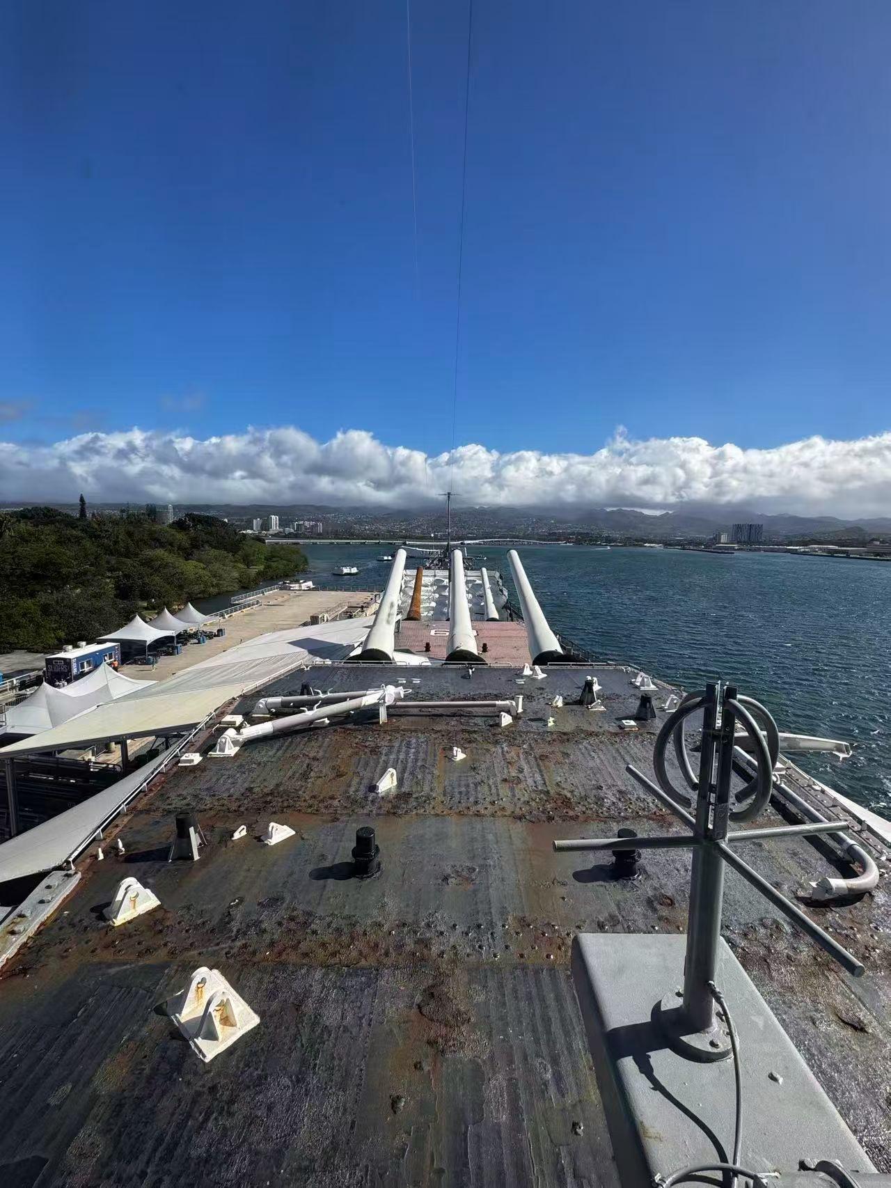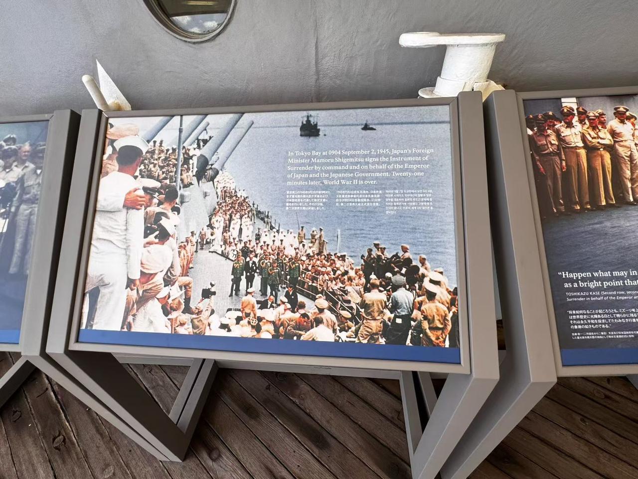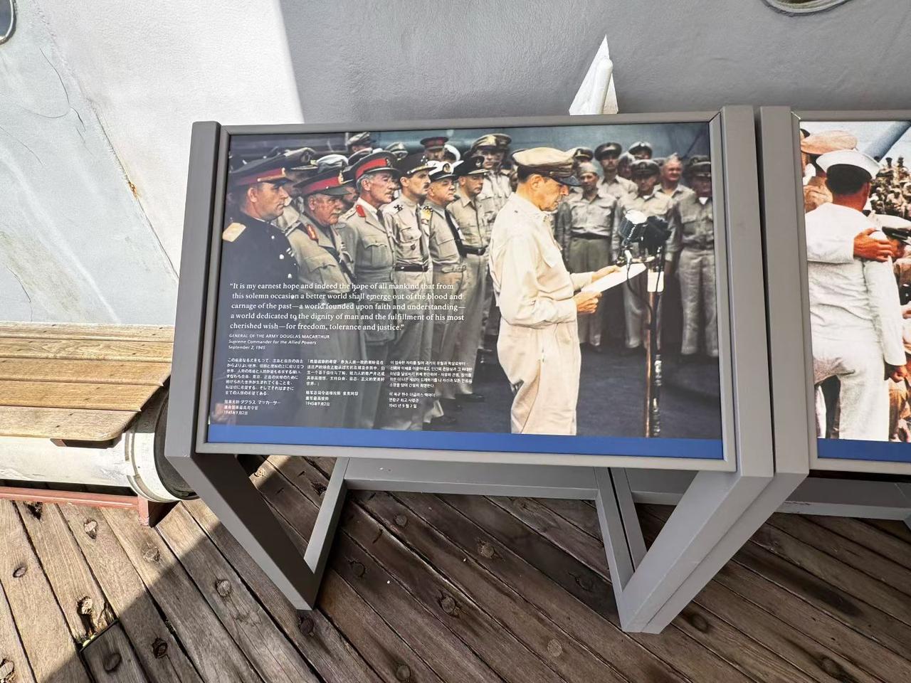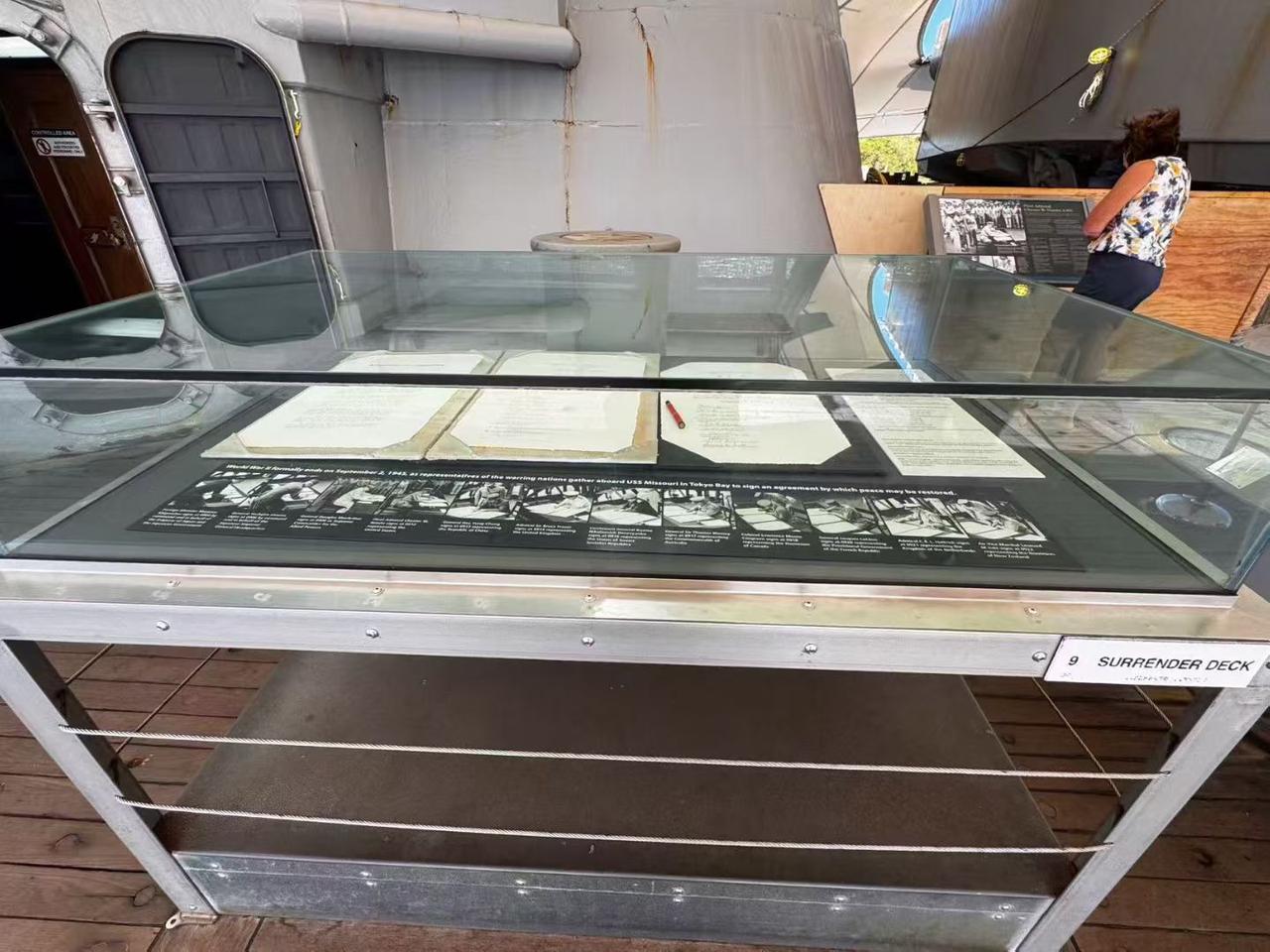 Menstravinsky: 作为一个中国人,站在密苏里号战列舰的甲板上完成对那段历史的一份凭吊是我长久以来的心愿。 1945年9月2日,日本在此签署投降书。此刻,我站在那个历史性的点位,这份投降书就在眼前,一些细节耐人寻味。它一式两份,盟军版工整无瑕,日方保管的那份却因加拿大代表科斯格雷夫单目失明视线不佳签错了行,留下了明显的涂改痕迹。尽管日方当场抗议,却也只能接受这份带有瑕疵的历史判决。 当时在场的《大公报》记者朱启平后来写到,“倒霉的日本人,连份投降书也不是干干净净的。”这仿佛是历史的某种隐喻。盟军代表签字的顺序严格遵循着盟国在反法西斯战争中的牺牲与贡献,中国代表徐永昌位列第二。 这个位置,是3500万中国军民——其中九成以上是平民——用血肉之躯换来的。当时,密苏里号停泊在东京湾的位置距离东京市中心约30-40公里,恰好在其主炮射程之内(37公里); 对此,有一个未经官方证实、仅在坊间流传的猜测:密苏里号停在此处,是为了应对日本当场反悔,可以随时开火。无论如何,这个安排确实完全符合战胜国的威慑心理:将受降仪式安排在战列舰上,炮口对准东京。这种威慑的意象完全契合战胜国当时的心态:这场仪式不仅是为了接受投降,更是为了确保和平不再被践踏。密苏里号已于1992年退役,现停泊在夏威夷珍珠港。密苏里号投降书