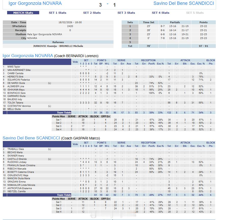 【欧冠女排八强附加赛首回合诺瓦拉3-1斯坎迪奇】国际排坛战报速递 2月18日诺瓦拉,欧冠女排八强附加赛意大利德比首回合,诺瓦拉主场3-1(25-22/25-21/22-25/25-23)击败斯坎迪奇。MVP托洛克32分、斯夸西尼和石川真佑各14分、阿尔斯迈尔12分,安特罗波娃27分、鲁丁斯13分、魏策尔10分。