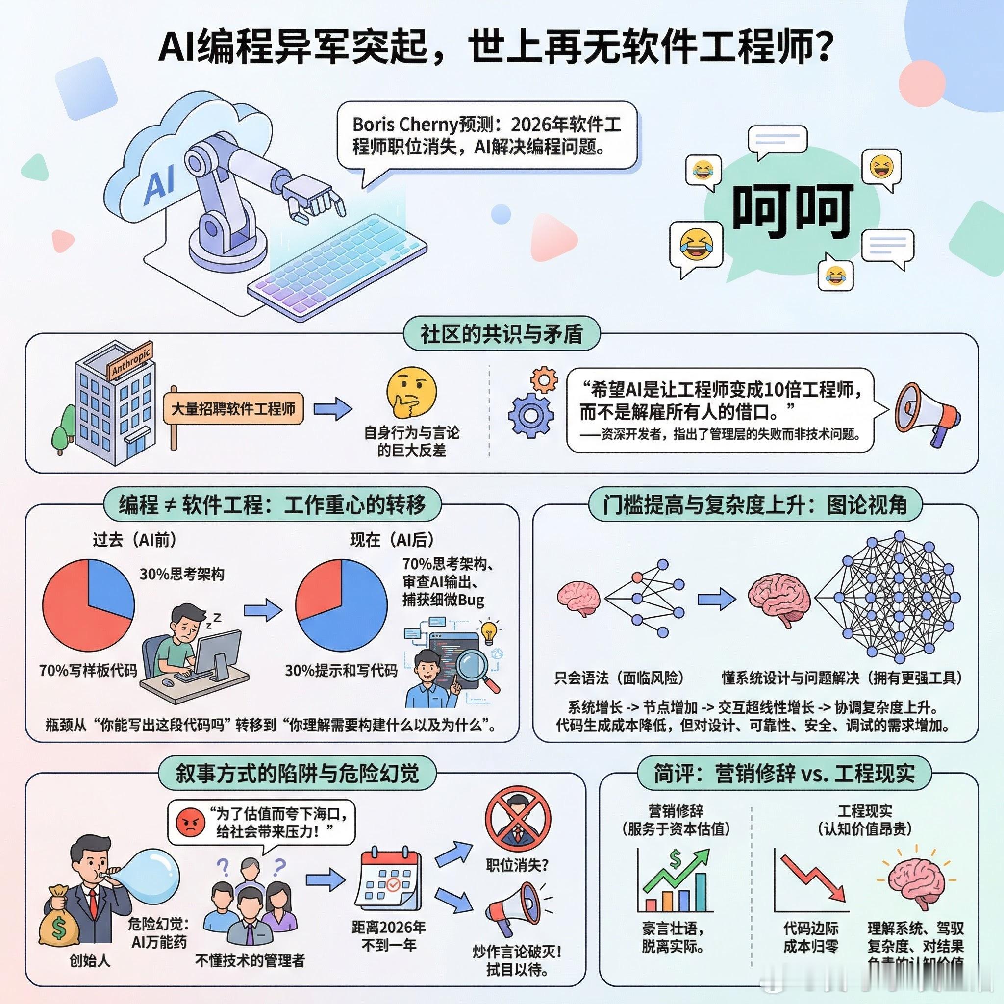 Anthropic创始人的豪言是一种服务于资本估值的营销修辞,而非工程现实。现实是:编程的低谷已至,但软件工程的高峰才刚刚开始。 代码的边际成本正在归零,但理解系统、驾驭复杂度、并对结果负责的认知价值,正在变得前所未有昂贵。