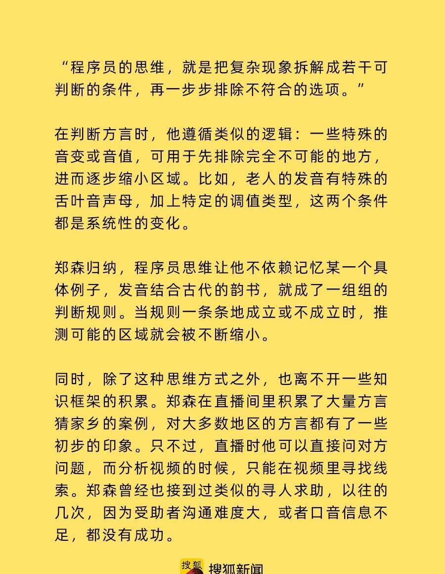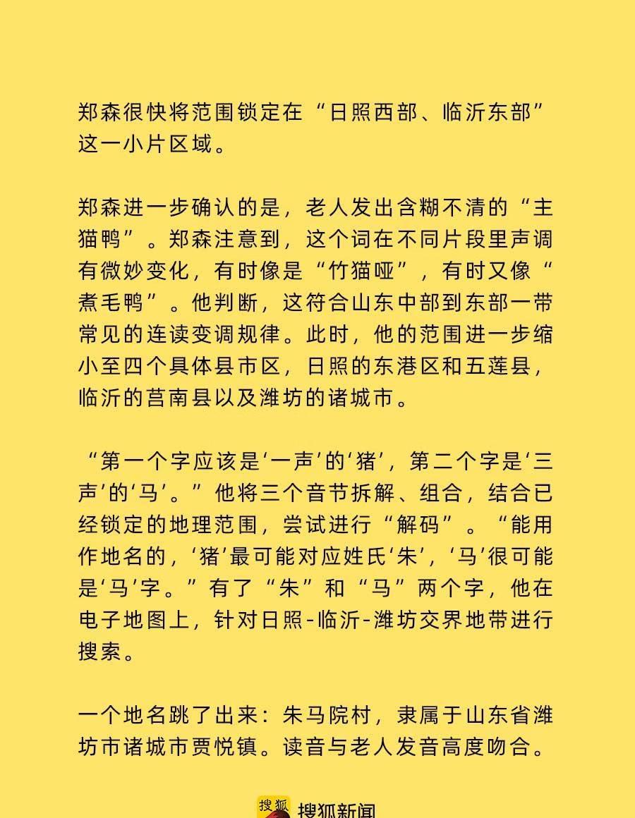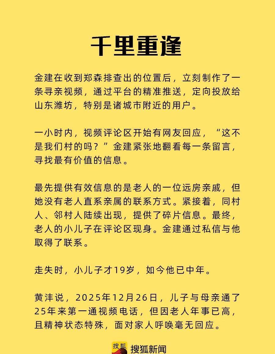 她走丢了25年,直到遇见一只“听懂”的耳朵 这是一位头发花白、衣衫破旧的流浪老人。她反复说着几个模糊的音节——“大桃”“大红文”。问她家在哪里,她嘟囔着“主猫鸭”或“祖玛雅”。 这段模糊不清的乡音,成为她与过往世界唯一的、脆弱的连接。2025年岁末,这位流浪老人在福州连江县街头被发现,当时还没有人能料到,几天之后,凭借着几个难解的音节,她踏上了千里之外的归乡路。 郑森正是那个破解方言密码的人。二十年来,兴趣推动着他积累了大量方言素材,他学习音韵学,用程序员的思维将方言当作一组组可被拆解、比对的“声学参数”。 这是一场在网络上的接力:郑森通过方言确定了老人的家乡,志愿者金建将寻亲视频发到互联网,并精准投放至老人家乡所在县市。走失25年的老人,借助网络,在24小时之内,找回了她的家乡。 老人 寻亲 寻人启事 乡音 方言 流浪老人 志愿者 回家