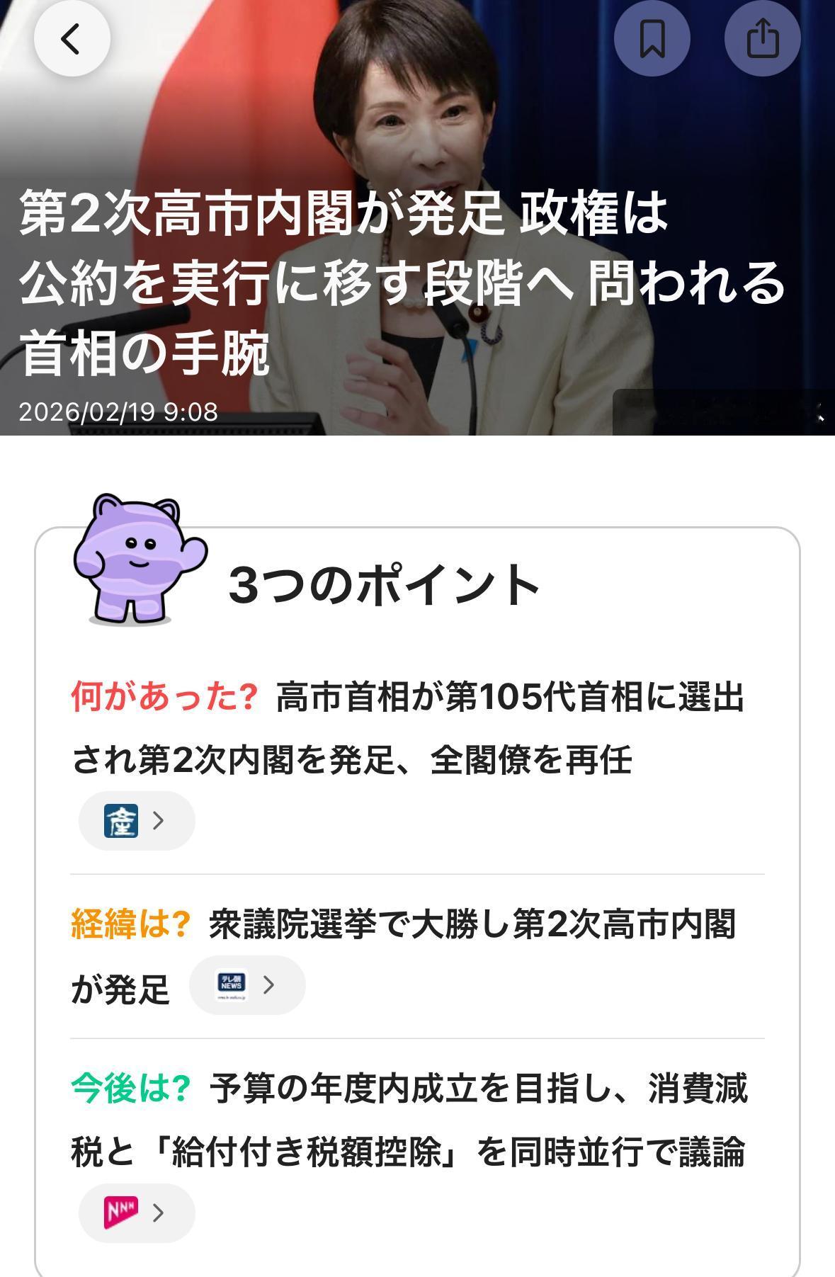 第二次高市内阁以“负责任的积极财政”为招牌重新启动。当前的焦点是,高市早苗首相所称的“夙愿”——下调消费税的走向。她能否在战后最多的压倒性议席优势背景下,在确保稳定财源的同时推动其实现,其执政能力正受到考验。 首相表示,将就为期两年的食品消费税率降为零的问题,在跨党派的“国民会议”上讨论财源和时间安排,力争在夏季前形成中期汇总方案。并计划在预计于今年秋季召开的临时国会上提交相关法案,设想在2026年度内实现。 另一方面,自民党内基于财政纪律的立场,慎重意见依然根深蒂固。首相提出通过审查补贴和税收特别措施作为替代财源,但能否填补每年约5万亿日元规模的减收仍不明朗。若实现时间推后,政策结束时间将接近2028年夏季的参议院选举,届时恢复原税率的难度也将提高。 能否在“国民会议”上获得在野党的广泛支持同样是一大课题。中道改革联合代表小川淳也表示,“无意为政权制造借口背书”,加以牵制。国民民主党代表玉木雄一郎也指出,鉴于首相将消费税减税定位为过渡至“附带给付的税额抵免”的措施,“不如先讨论附带给付的税额抵免更有成果”。 此外,首相还将全力推进制定反间谍法和修改宪法等“分裂国论的政策”。这些议题都将对战后日本社会的形态带来重大转变,因此需要谨慎掌舵。 随着自民党在众议院选举中大胜,联合执政的日本维新会影响力似乎有所下降。其代表吉村洋文将削减众议院议员定员数定位为改革的“核心支点”,但已有观点认为“势头正在减弱”。围绕副首都构想的讨论也被指出陷入停滞。 —-增税的时候很快就来。等减税的时候,争论了大半年了,转眼高市内阁也起步半年了,还要2026年度内才能实现,估计消费税减税还没出来又将迎来几波涨价潮了。大家最关心的物价上涨对策一直没有出来,再没有成绩做出来高市可以下台了。现在主要问题是,看日本政坛在野党没有能取代高市的一呼百应的标杆性人物,自民党内小泉进次郎等竞争对手都被收买了,石破等被打压,原来自民党内很强的小石河联盟破了。高市目前在日本政坛还是几乎没有强有力的竞争对手