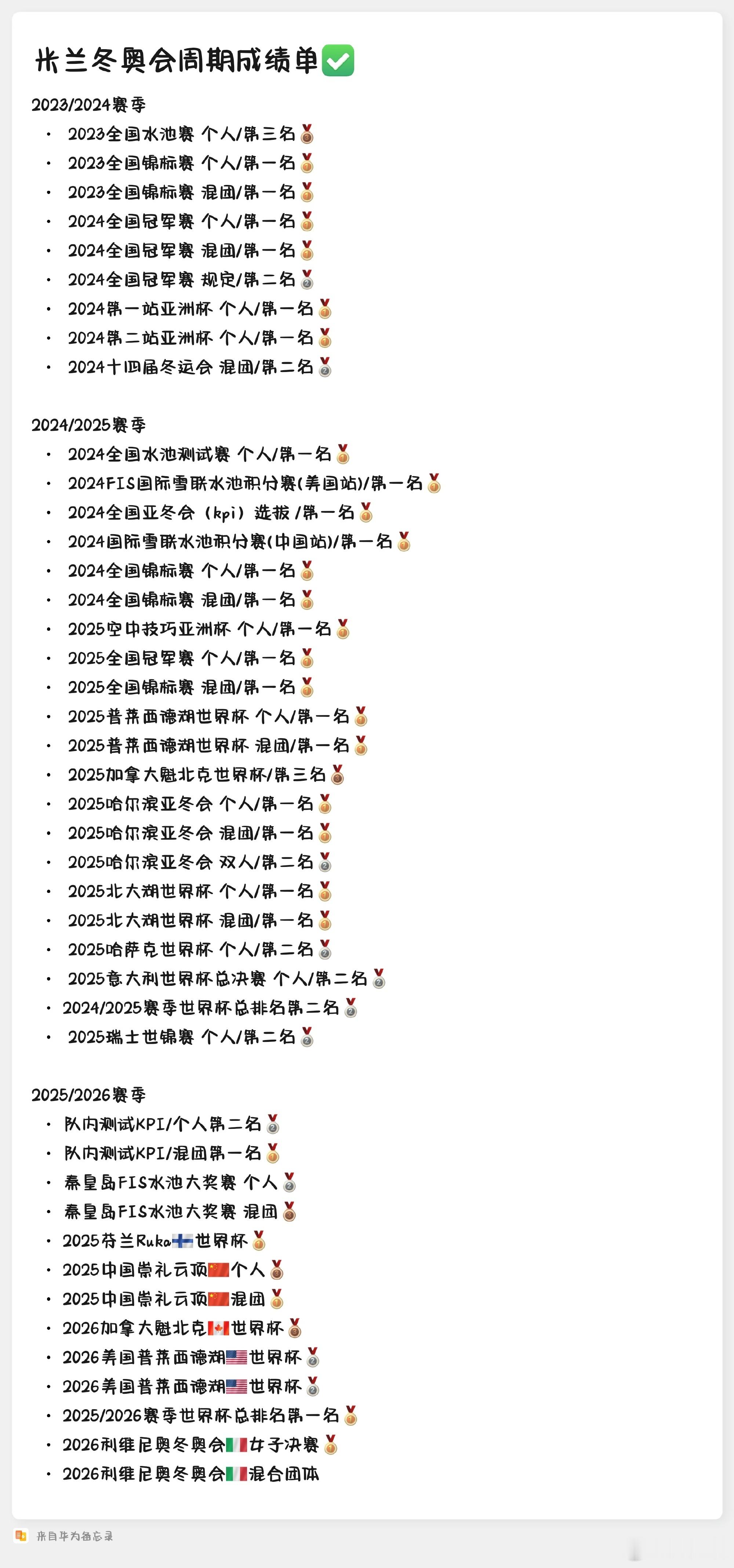 【徐梦桃回顾冬奥卫冕路】徐梦桃晒米兰冬奥周期成绩单 中国选手徐梦桃18日在米兰冬奥会自由式滑雪女子空中技巧决赛中摘得金牌,成功卫冕。这是本届冬奥会中国代表团获得的第二枚金牌。