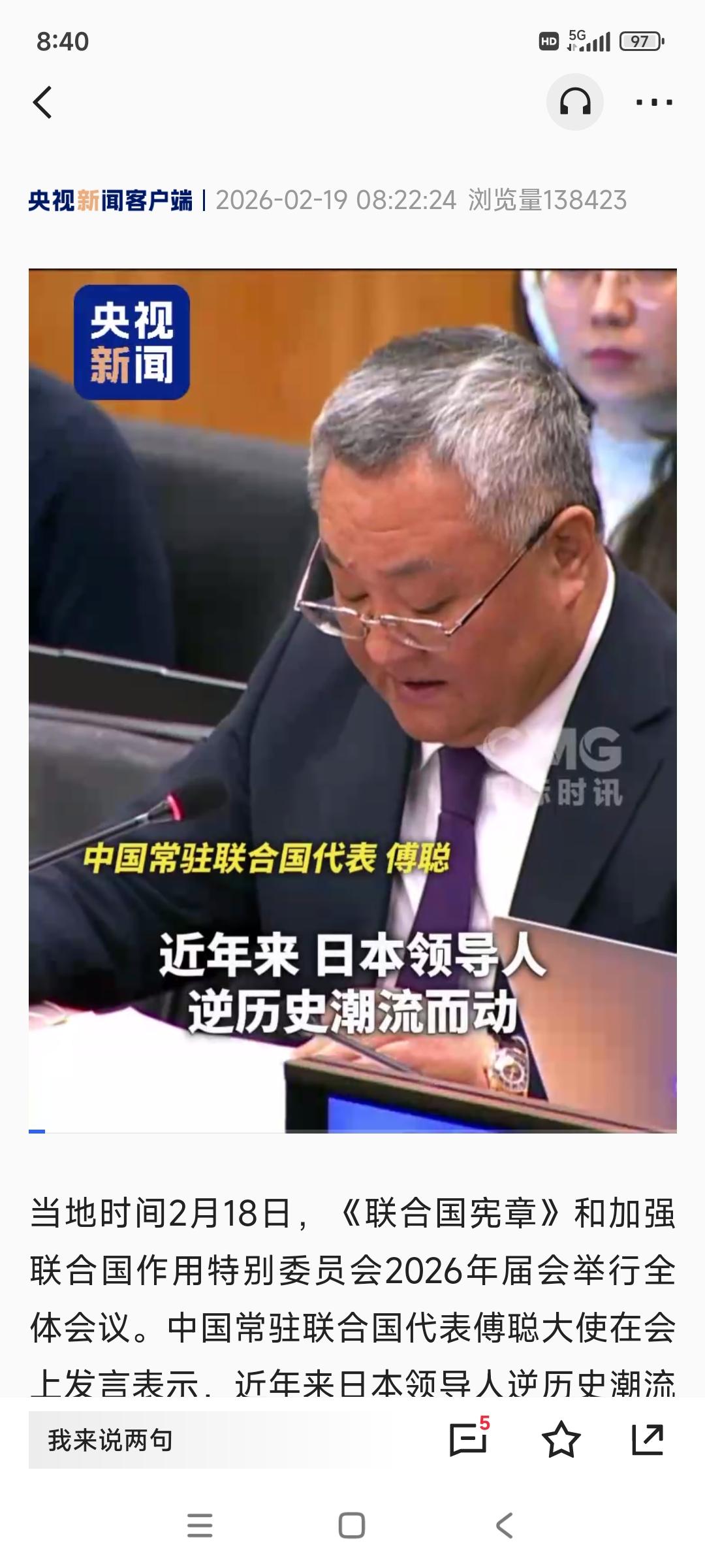中国常驻联合国代表傅聪发言:日本行使“集体自卫权”介入台湾问题 中方必将迎头痛击。 简评几句:中国在联合国摊牌:日本若插手台湾,就是侵略!中国常驻联合国代表傅聪大使直接点名日本,发出严正警告。 日本正企图借"集体自卫权"介入台湾问题,将中国台湾与所谓日本"存亡危机"相关联。对此,傅聪从四个角度上彻底驳斥: 法律上,日本用国内法覆盖国际义务,纯属偷梁换柱; 历史上,战败国无权对战胜国领土指手画脚; 行动上,中方警告:无论任何借口介入台湾,都将构成对中国的侵略,中方必将迎头痛击! 道义上,这是对《联合国宪章》和二战秩序的公然挑衅。 70多年前日本军国主义给亚洲带来灾难,如今若有人想重蹈覆辙,等待他们的必是更彻底的失败。