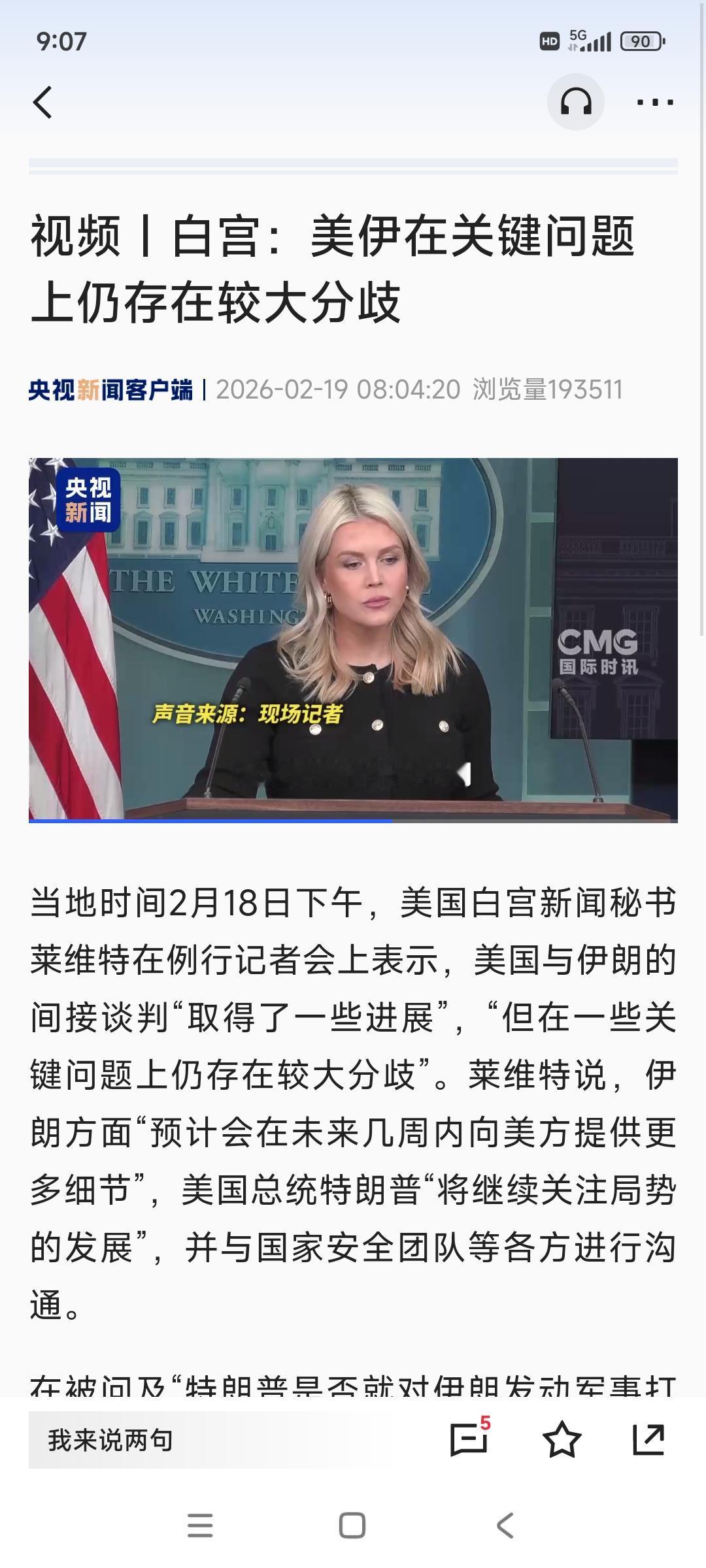 当地时间2月18日下午,美国白宫新闻秘书莱维特在例行记者会上表示,美国与伊朗的间接谈判“取得了一些进展”,“但在一些关键问题上仍存在较大分歧”。莱维特说,伊朗方面“预计会在未来几周内向美方提供更多细节”,美国总统特朗普“将继续关注局势的发展”,并与国家安全团队等各方进行沟通。 在被问及“特朗普是否就对伊朗发动军事打击设定最后期限”时,莱维特表示她无权回答此类问题。莱维特强调,“伊朗若能与美国政府达成协议,将是明智之举。” 评几句:白宫发言人撂下一句“狠话”,伊朗只剩“明智”或“灭亡”两条路?美国白宫记者会爆料!关于美伊之间的“间接谈判”,美方罕见松口承认:“有进展,但分歧巨大”! 然而,更耐人寻味的是发言人莱维特的最后那句警告:“伊朗若能与美国政府达成协议,将是明智之举。”这句话听起来像是劝告,但结合上下文,简直是赤裸裸的最后通牒!从以下3点具体分析一下: 1 “明智”二字有多重? 在外交辞令中,如果一方对另一方说“这样做才是明智的”,潜台词往往是:“如果你不明智,后果自负。” 这不仅仅是谈判桌上的施压,更像是战场前的“仁慈时刻”。 2 战争红线被触碰? 当记者追问“是否设定军事打击最后期限”时,发言人竟拒绝回答!在华盛顿的政治游戏里,“不否认”往往就是最危险的信号。 这等于把“军事选项”明晃晃地摆在了桌面上。 3 未来几周定生死? 美方透露,伊朗将在“未来几周”提供更多细节。这意味着接下来的30天,将是决定波斯湾是迎来和平协议,还是陷入战火的关键窗口期! 特朗普正在紧盯着局势发展,而德黑兰正站在十字路口:一边是放下身段换取生存空间的“明智之举”; 另一边是在强压下的绝地反击。 你认为伊朗会妥协“明智”,还是会硬刚到底?这场“胆小鬼游戏”谁会先眨眼?