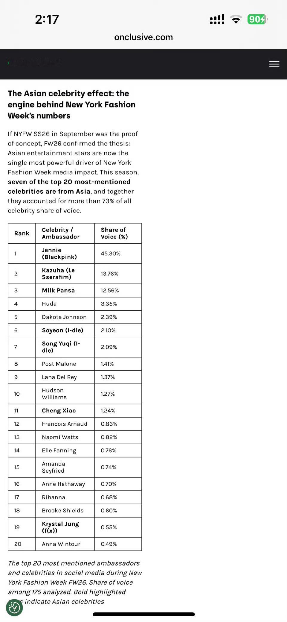 本季纽约时装周媒体影响力最高的二十位明星1.Jennie 2.中村一叶6.田小娟 7.宋雨琦 11.程潇 19.郑秀晶