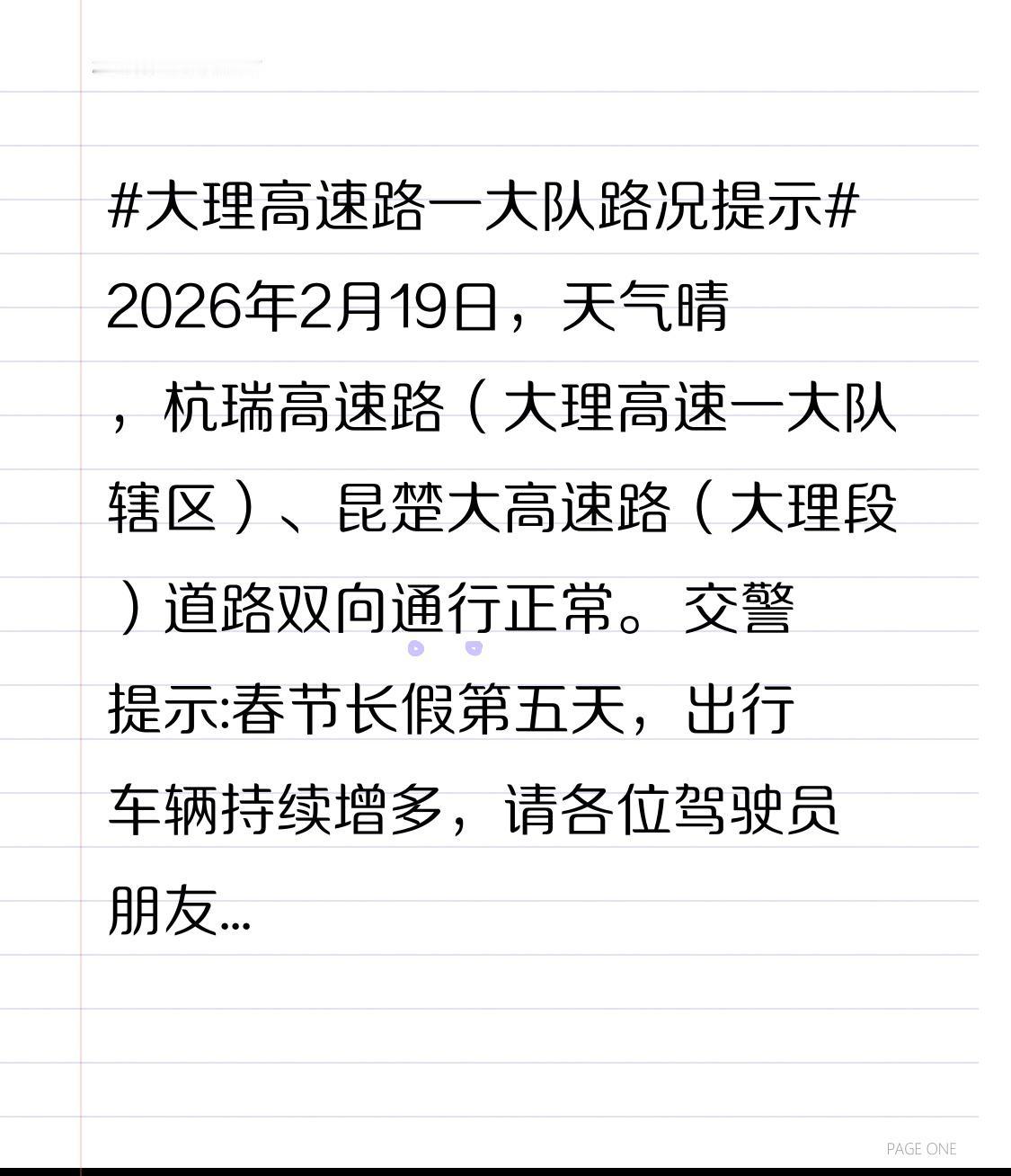 2026年2月19日,天气晴朗,杭瑞高速路(大理高速一大队辖区)、昆楚大高速路(大理段)道路双向通行状况良好。 交警提示:春节长假第五天,出行车辆持续增加。请各位驾驶员朋友出行前提前了解路况信息,规划好行车路线,保持足够的跟车距离,切勿随意穿插、变更车道,杜绝疲劳驾驶、超员、超速等行为。大理高速一大队祝您一路平安! 大理高速公路三大队路况信息 2026年2月19日,辖区天气晴朗,杭瑞高速(大保段)、大漾云高速、云兰高速(大理段)、永昌高速道路双向通行正常。 交警提示:春节期间辖区车流量较大,驾车出行务必控制好车速,保持充足睡眠,集中注意力,严禁疲劳驾驶、超速行驶、无证驾驶、随意停车、变更车道、穿插等不良驾车行为。行车途中请系好安全带,出行前检查好车辆状况,确保出行安全。大理高速公路三大队祝您春节愉快、一路平安! 大理交管支队高速四大队路况提示:2026年2月19日,天气晴朗,辖区道路双向通行正常。春节假期大丽高速车流较大,尤其是花椒箐隧道至双廊收费站路段车流量剧增,交通压力大,车辆通行缓慢,易出现拥堵情况。 交警提示:春节期间丽江至昆明往返车辆,行驶丽上高速——宾鹤高速——宾南高速——新楚大高速路线较为便捷。宾鹤高速路段加油站与服务区还未正式投入使用,驾车出行时请注意提前备好充足油料和电量,提前规划好出行路线。大理高速公路四大队祝您一路平安!