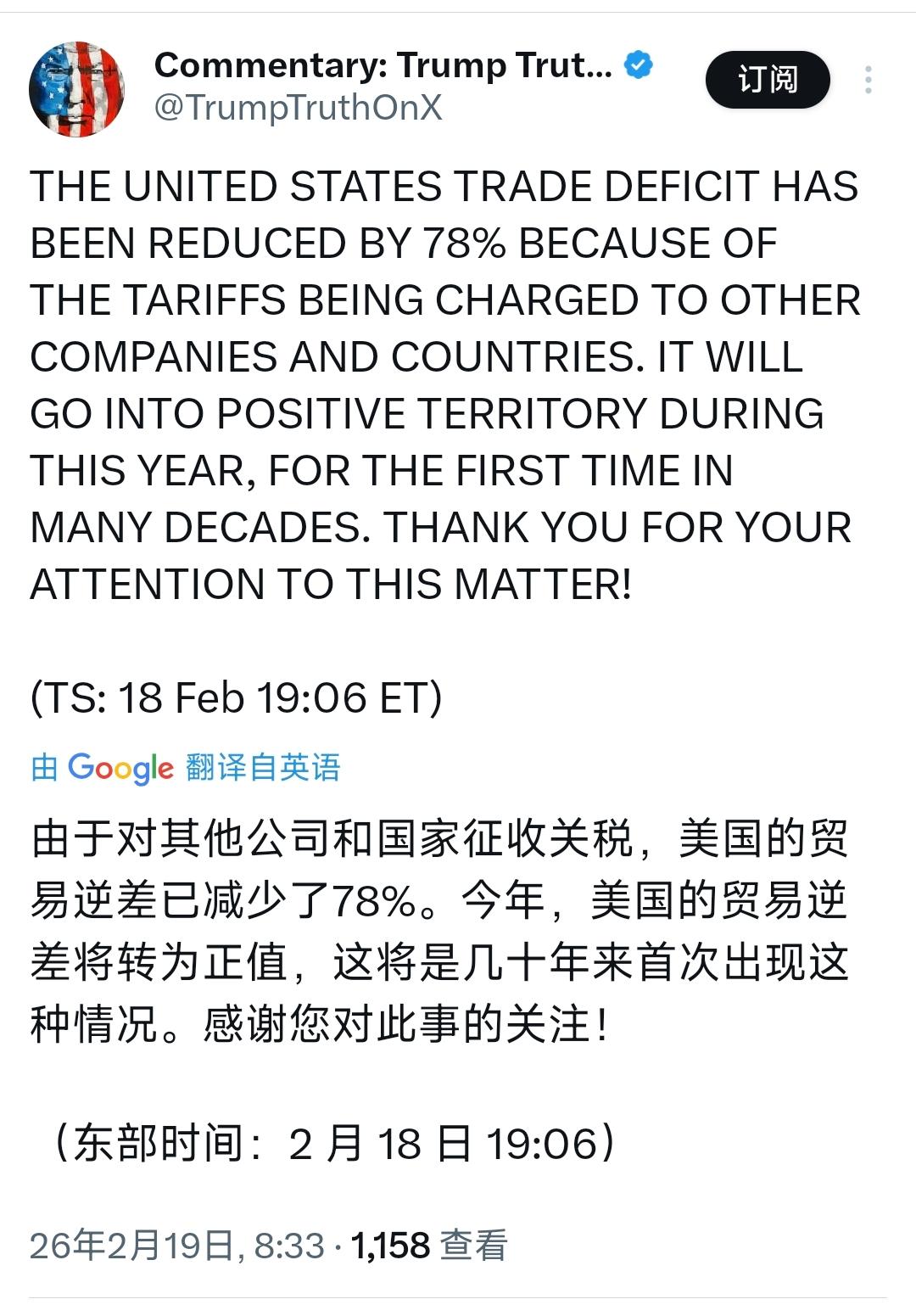 特朗普今天(北京时间2月19日)发文写道:“由于对其他公司和国家征收关税,美国的贸易逆差已减少了78%。今年,美国的贸易逆差将转为正值,这将是几十年来首次出现这种情况。感谢您对此事的关注!” [机智]评几句:特朗普又双叒叕编造虚假数字,公然宣称关税让美国贸易逆差减少78%、今年将转正,这是赤裸裸的经济谎言。2025年美国贸易逆差仍高达上万亿美元,11月单月逆差更是环比暴增近95%,现实数据狠狠打脸。他无视美国产业空心化、高消费低储蓄的结构性顽疾,把关税大棒包装成救世良方,本质是用虚假数据欺骗民众、粉饰政绩。所谓“逆差转正”违背基本经济常识,纯属天方夜谭。这种张口就来的政治操弄,早已是美式民粹的惯用套路,既暴露了他对经济规律的无知,也尽显霸权国家撒谎成性的荒诞底色,只会让美国国际信誉持续破产。