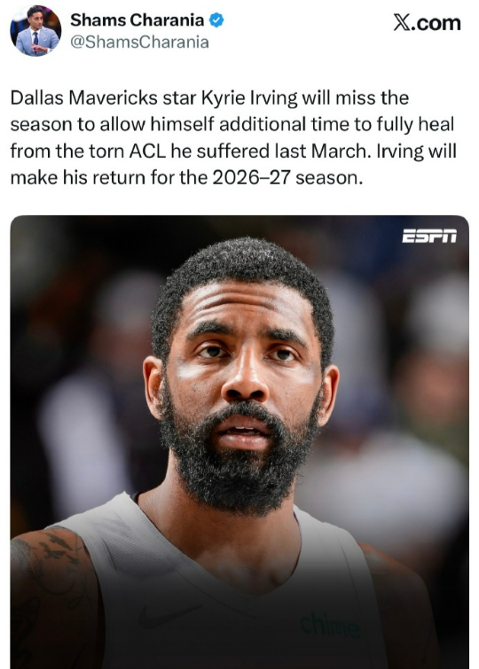 Shams:欧文赛季报销!!! 达拉斯独行侠队球星凯里·欧文将缺席本赛季,以便给自己更多时间从去年三月遭受的前十字韧带撕裂伤势中完全康复。欧文将在2026-27赛季重返赛场。