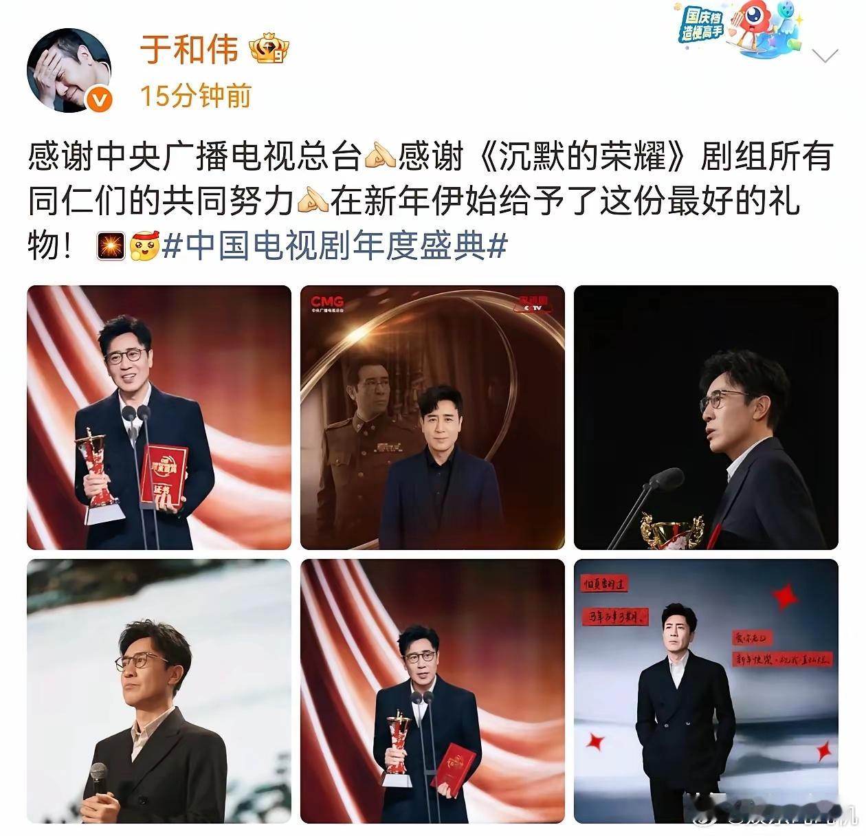 于和伟,高调发文!2月17日深夜,许多人都已经进入了梦乡,于和伟却罕见的无法入睡,最后还是激动的在社交平台发文,纪念这个特殊的时刻。原来,在刚落幕的中国电视剧年度盛典上,于和伟凭借《沉默的荣耀》斩获重要奖项,他的获奖感言却让全网破防。领奖台上,他手捧奖杯和荣誉证书,没有大谈个人付出,而是第一时间鞠躬致谢:“感谢总台,感谢《沉默的荣耀》剧组所有同仁的共同努力,新年伊始,这是最好的礼物。” 一句话,把所有光环都还给了集体。熟悉于和伟的观众都知道,他在《沉默的荣耀》里饰演的角色层次复杂,从隐忍到爆发,每一个眼神都充满张力。但他始终强调,角色的成功离不开导演的精准把控、编剧的扎实剧本,以及全剧组不分昼夜的打磨。这份清醒和谦逊,瞬间戳中了网友。有人评论:“奖杯是个人的,但荣耀是大家的,这才是演员该有的样子。” 也有粉丝翻出他过往采访,发现他多次说过“好演员要沉在角色里,而不是浮在名利上”。从《觉醒年代》到《沉默的荣耀》,于和伟用一部部作品证明,真正的实力派从不需要靠炒作博眼球,而是用作品说话,用格局圈粉。这次获奖,既是对他演技的肯定,更是对他职业操守的最好注脚。