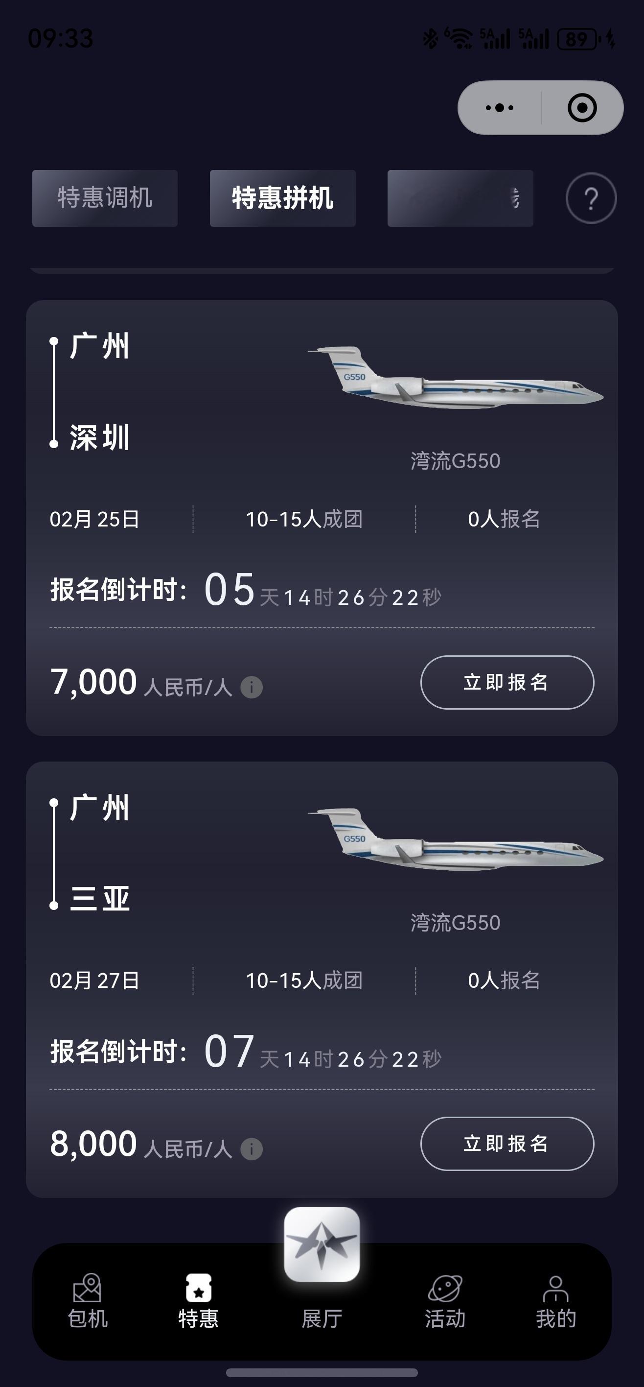 2月27日 广州—三亚 湾流G550 8000元一位