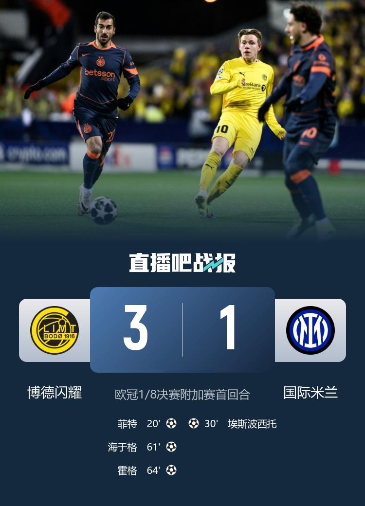 强大的国米要出局了!欧冠附加赛首回合,国米1-3不敌博德闪耀。 博德闪耀能晋级附加赛完全靠最后两轮击败欧冠劲旅曼城、马竞。 先是主场3-1击败曼城,最后一轮客场2-1击败马竞。 由于没有客场进球优势规则了,所以首回合赢球的球队,最后基本晋级了。