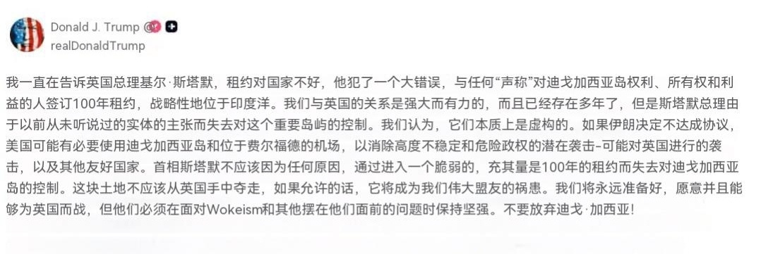 特朗普谈迪戈加西亚岛:我一直告诉基尔·斯塔默首相,在涉及国家主权问题时,租约根本不可行。他与任何声称对迪戈加西亚岛拥有权利、所有权和利益的主体签订100年租约,是在犯下严重错误。