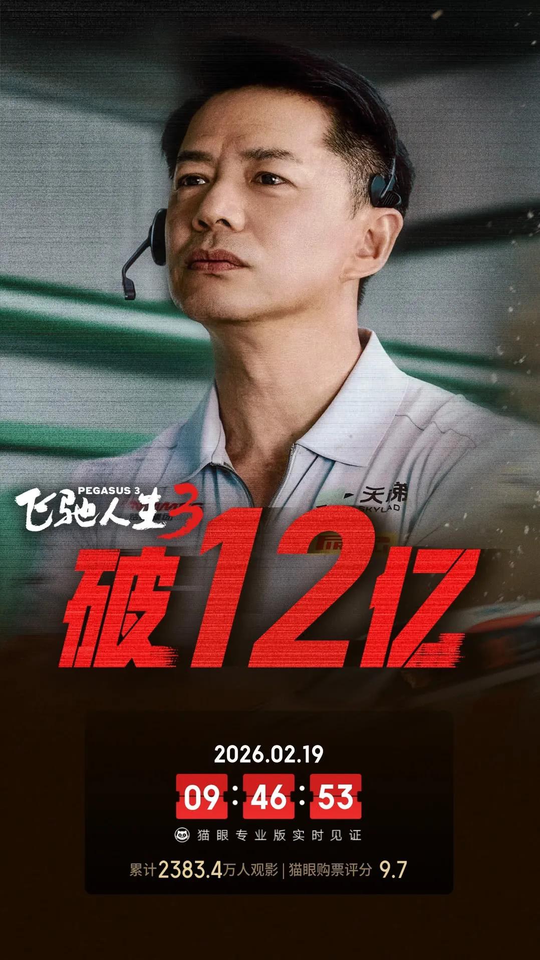 《飞驰人生3》票房破12亿,进入内地影史百强。 由韩寒执导,沈腾、尹正、黄景瑜、张本煜领衔主演,魏翔、沙溢、范丞丞、孙艺洲主演,段奕宏特邀主演,张新成、胡先煦、李治廷、白宇帆、周政杰、高华阳特别出演,贾冰、王安宇、陈永胜、冯绍峰、郝瀚友情出演的2026春节档热血赛车题材喜剧电影《飞驰人生3》累计综合票房破12亿,已冲进中国内地影史票房总榜百强、春节档历史25强。 续集电影自带热度,而《飞驰人生》系列前2部也累积了规模不小的观众,《飞驰人生3》在2026春节档可谓所向披靡。《飞驰人生3》主要角色均为男性,也被调侃为全男电影,不过能取得如此高的票房,自然也不乏女性观众的支持。电影飞驰人生3 飞驰人生第三部 飞驰人生3 春节档电影