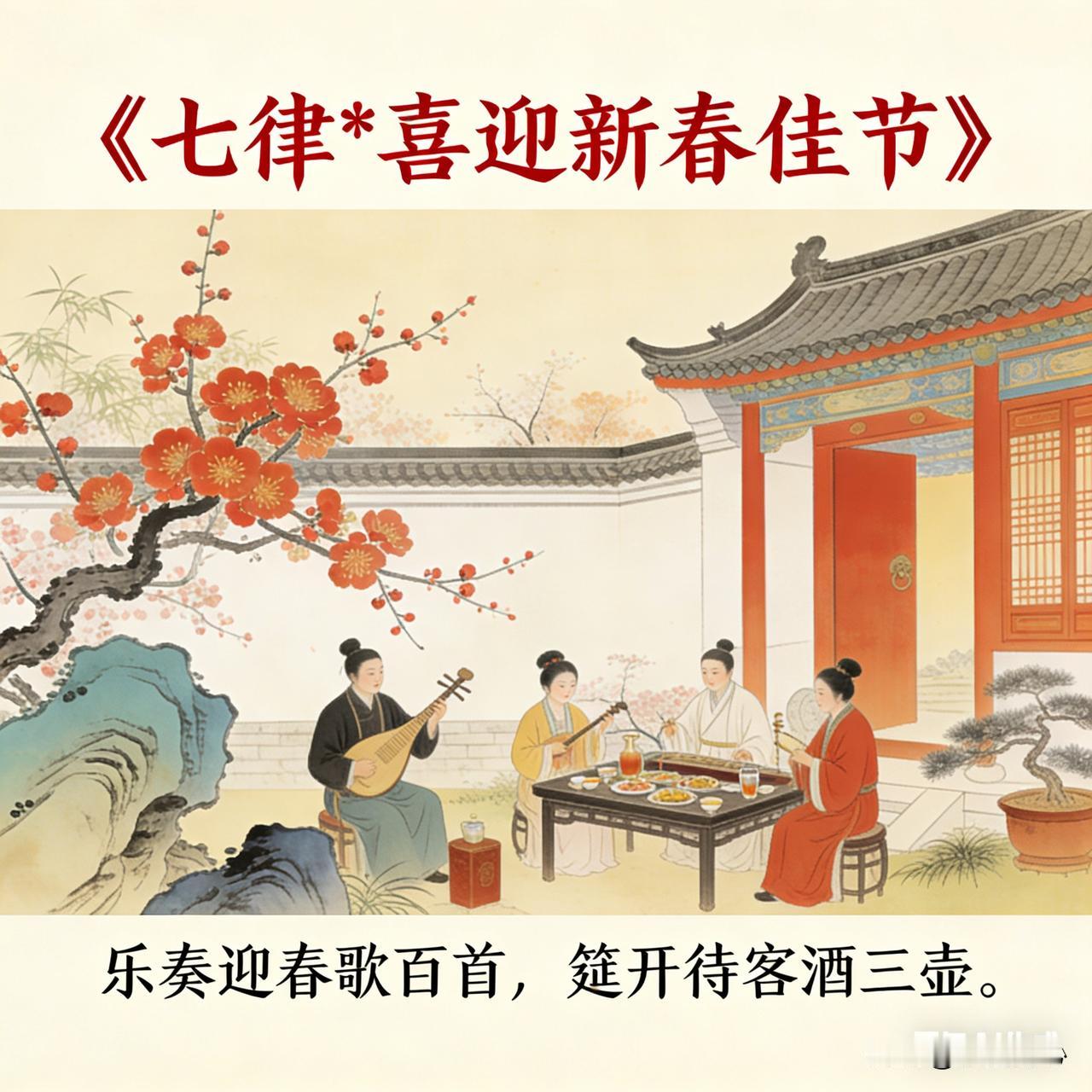 《七律*喜迎新春佳节》乐韵诗心原创诗词: 梅绽庭边万物苏, 缤纷焰火灿如图。 堂前灯亮光盈室, 灶土肴香味满厨。 乐奏迎春歌百首, 筵开待客酒三壶。 飞来瑞雪丰年兆, 喜把新桃换旧符。 这首诗描绘了新春佳节的热闹欢腾。庭院梅花绽放昭示万物复苏,绚烂焰火璀璨如画。堂前明灯高挂点亮满屋暖意,厨房中饭菜飘香勾人馋涎。乐声奏响迎春欢歌,宴席摆开佳酿满壶。瑞雪纷飞预兆丰年,人们换上新桃符,满是辞旧迎新的喜庆与对新年的美好祈愿。