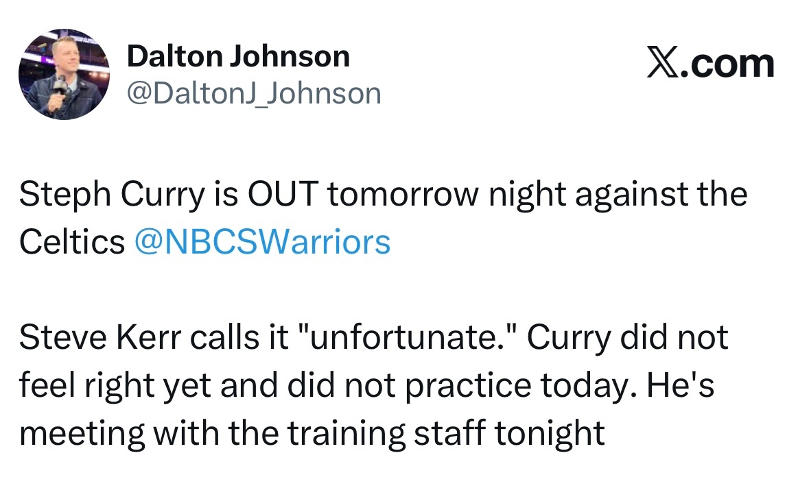 库里缺席明日对阵凯尔特人的比赛,科尔称这“很不幸”。库里目前仍感觉不适,今日也未参加训练。他今晚将与训练团队会面。