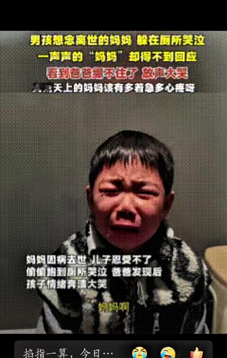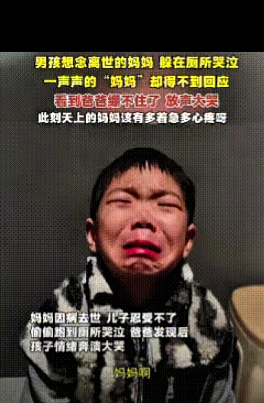 泪目!男孩回家后一反常态,告诉老爸说要去厕所待会,老爸刚开始以为是儿子要去上厕所,父亲起初并没有多想,以为孩子只是正常如厕,可过了几分钟,孩子依旧没有出来。结合进门时孩子低落的神情,父亲心里隐隐觉得不安,便轻轻走到厕所门口。 里面没有任何声响,只有压抑不住的哭泣声。父亲一下子就明白了,孩子是想念已经离开的妈妈了。他不想当着父亲的面流泪,怕大人跟着伤心,于是选择把最脆弱的一面藏起来,独自承受思念的痛苦。 站在门外的父亲,心里满是心疼与无奈,千言万语最终只化作一句温和的询问:“好点没有啊?”就是这一句简单的关心,让孩子再也绷不住,积攒已久的情绪彻底释放出来。 很多人都说,父母是一个家的根,父母在,家才完整。失去任何一位亲人,对整个家庭都是难以弥补的空缺。孩子的懂事,父亲的无措,都是最真实的亲情模样,没有华丽的表达,却藏着最深的牵挂与不舍。 我们总希望孩子坚强懂事,却常常忽略他们也有难过和脆弱的时候。有些伤痛不会随着时间消失,只会被悄悄藏起来,而真正的爱,就是允许彼此有崩溃的权利。 愿这个孩子能在爱与陪伴中慢慢治愈,带着妈妈的期许好好长大。也愿每一份深藏的思念,都能被温柔善待。